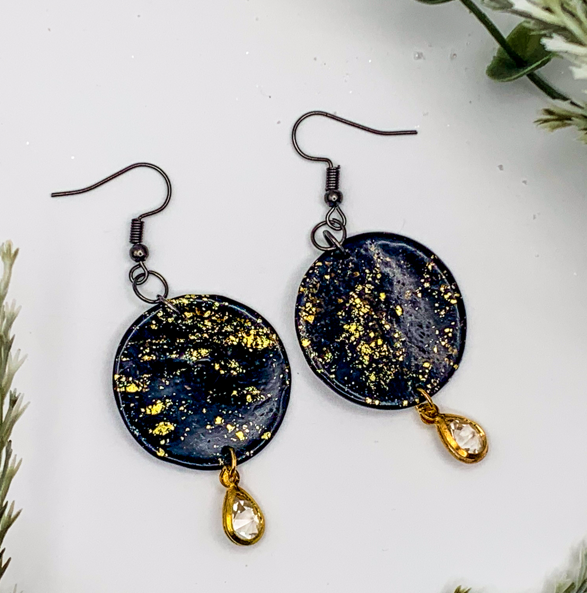 A celestial masterpiece! These round black clay discs with golden flecks are finished with a sparkling teardrop charm for extra glam.