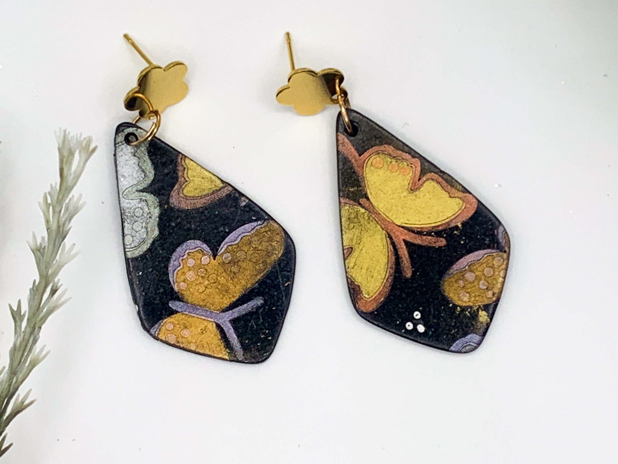 A touch of elegance! These asymmetrical black clay earrings feature golden butterflies with hand-painted details for a bold, artistic statement.