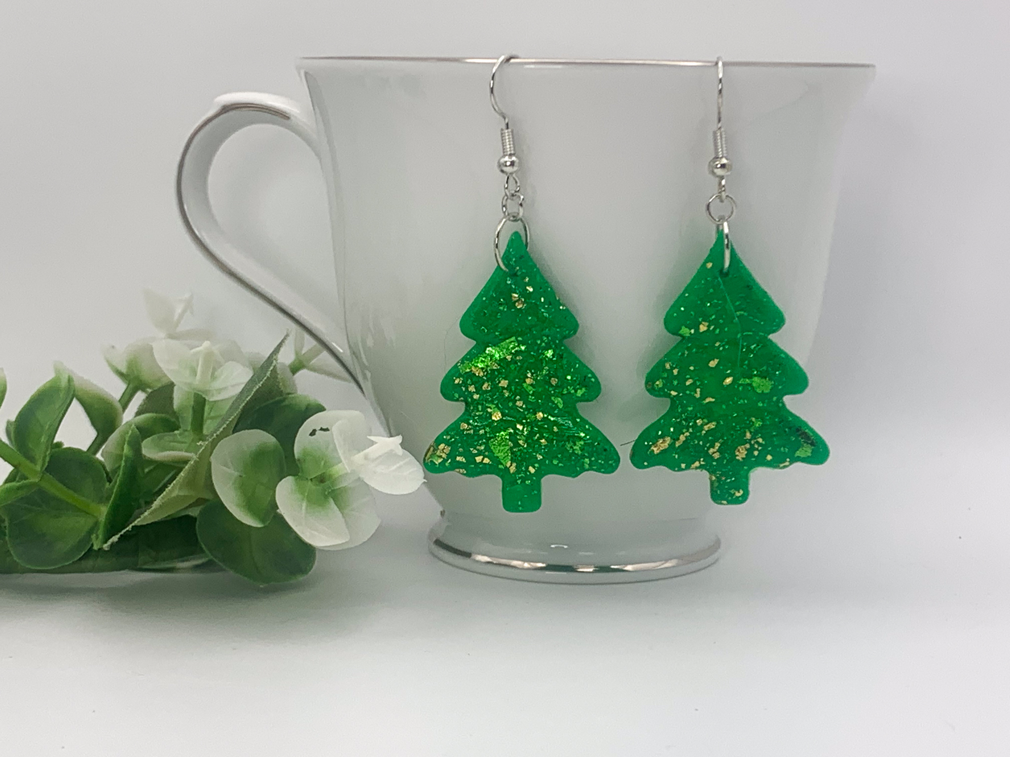 Add a golden touch to your holiday look with these glitter-infused Christmas tree earrings! Their vibrant green and shimmering gold and green foil accents make them a dazzling seasonal statement.