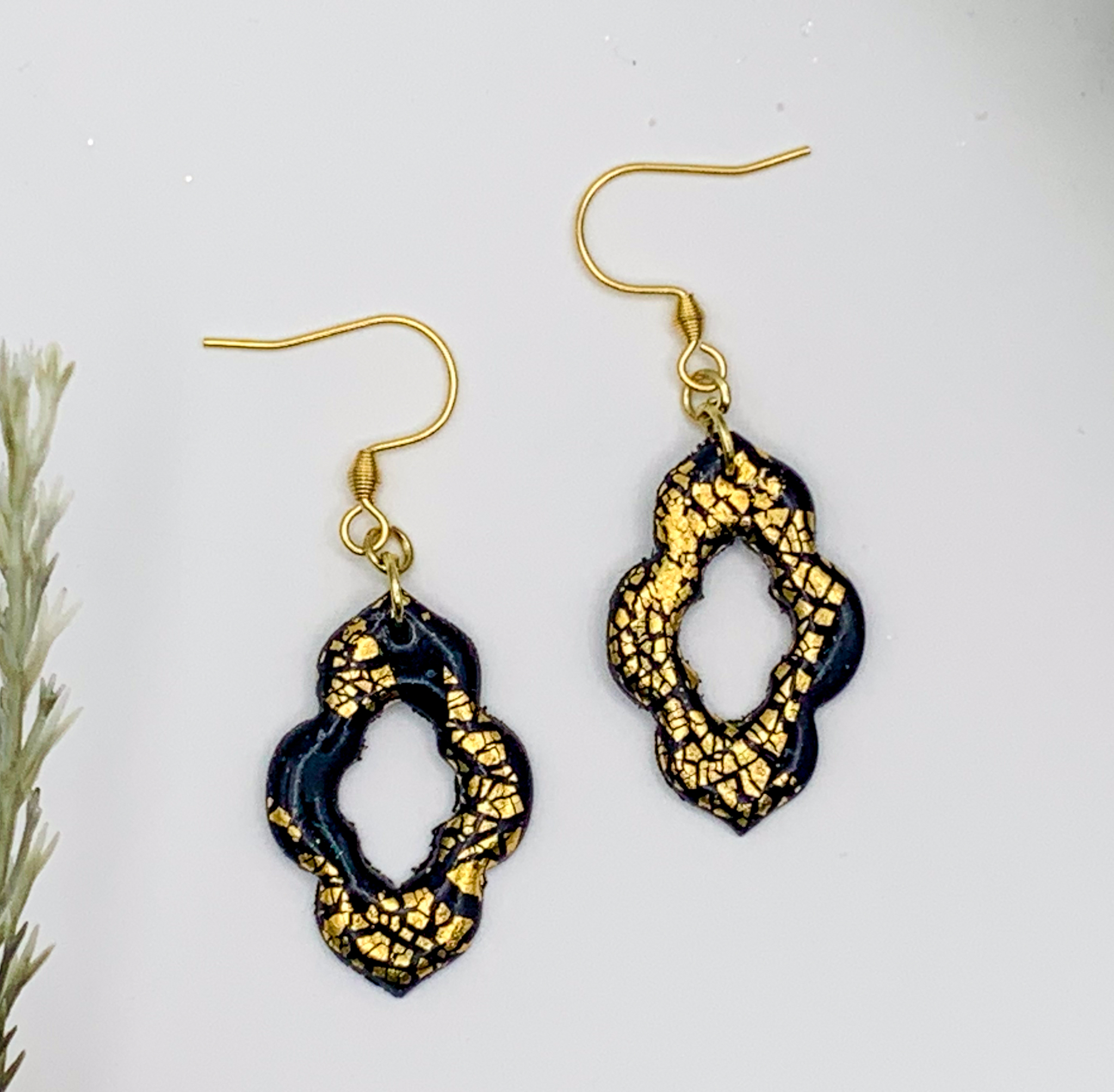 Add a touch of exotic elegance! These Moroccan-inspired cutout earrings feature black clay with shimmering gold foil for a rich, luxurious look.