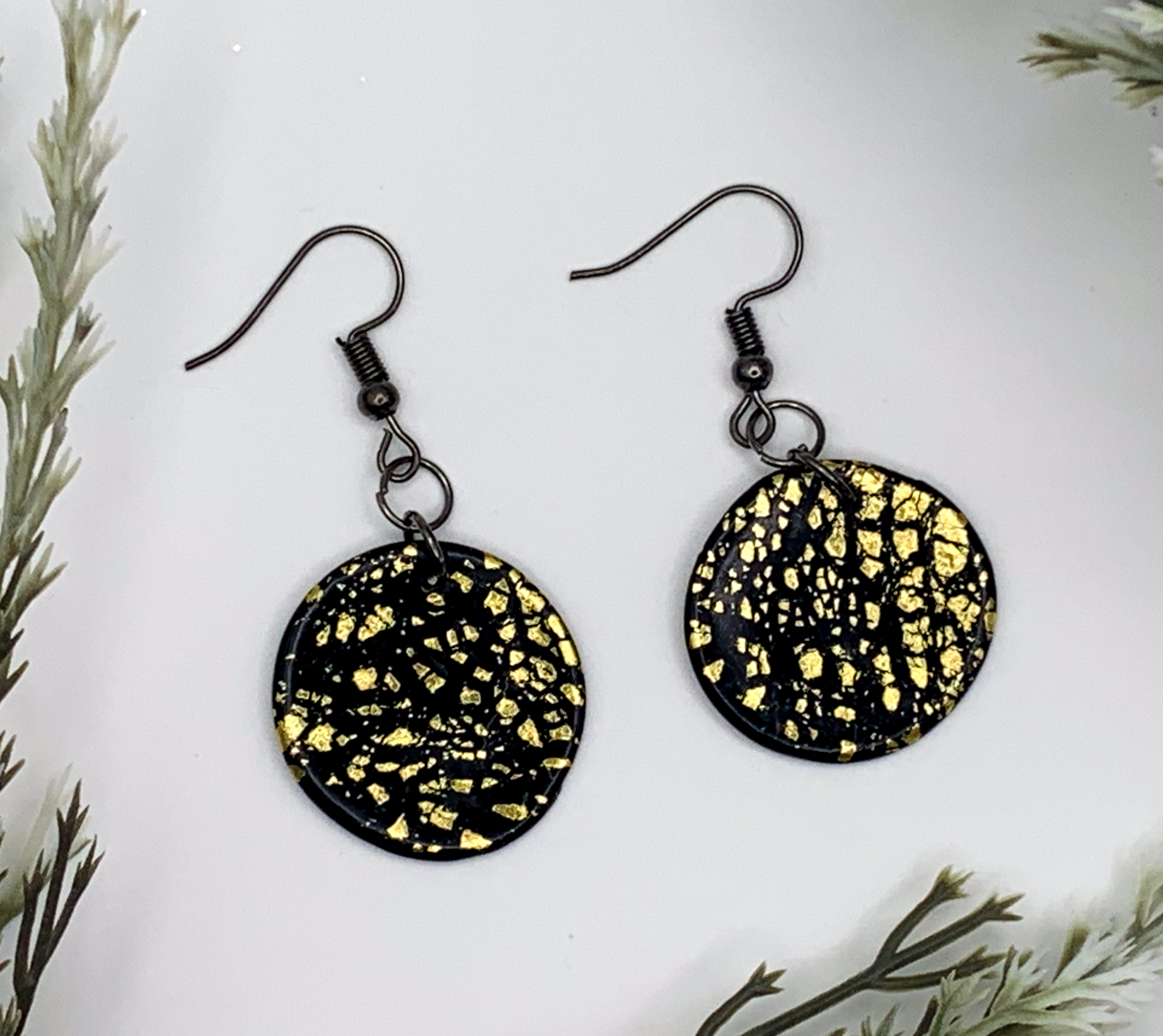 Turn heads with these bold mosaic-inspired earrings! Black clay discs are adorned with shimmering gold foil for a luxe, textured look.