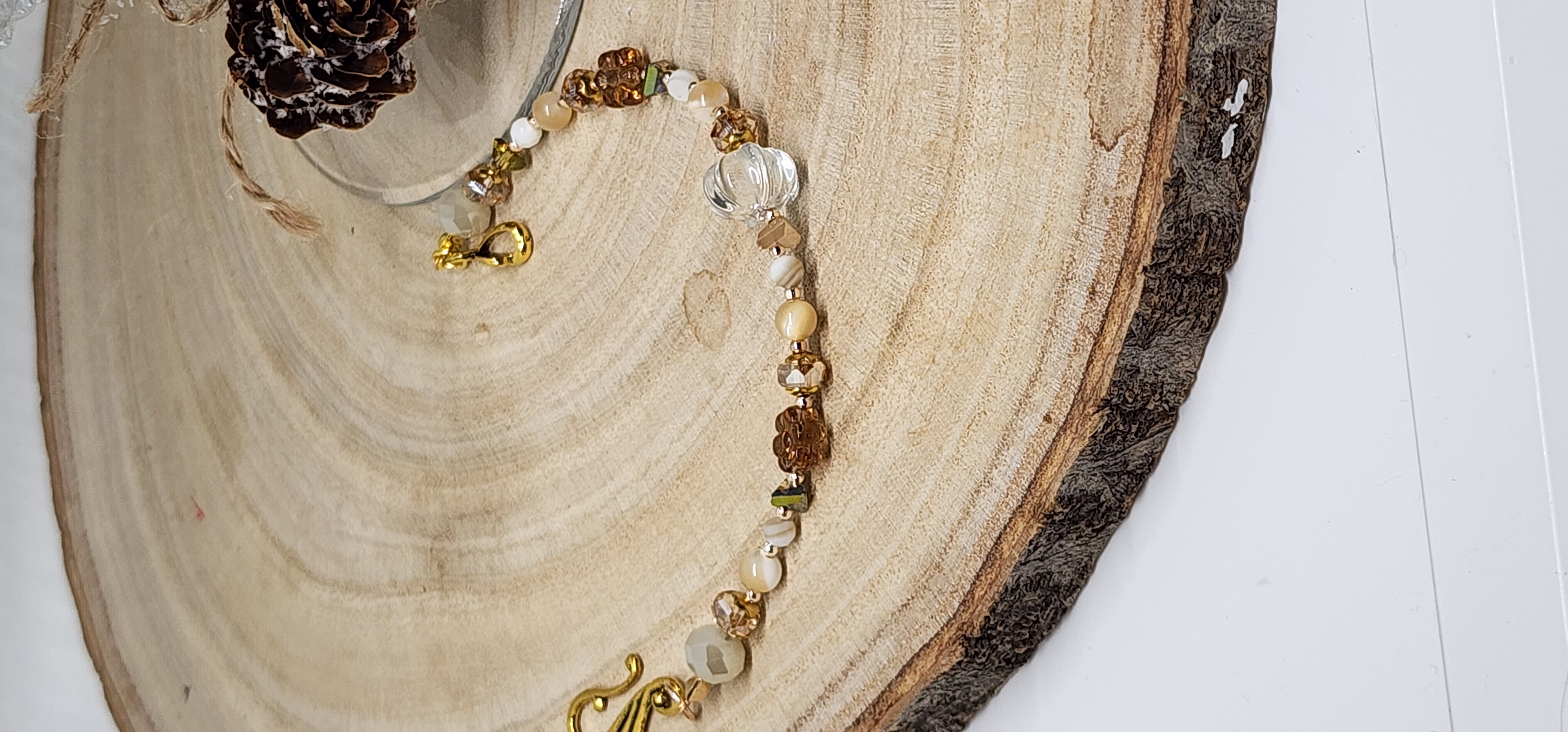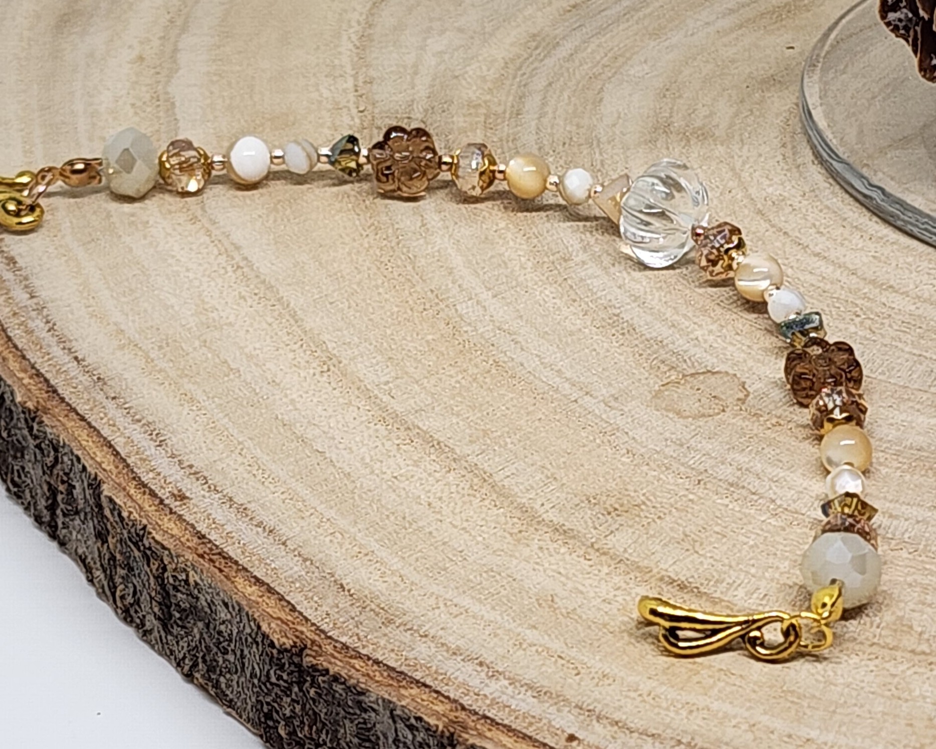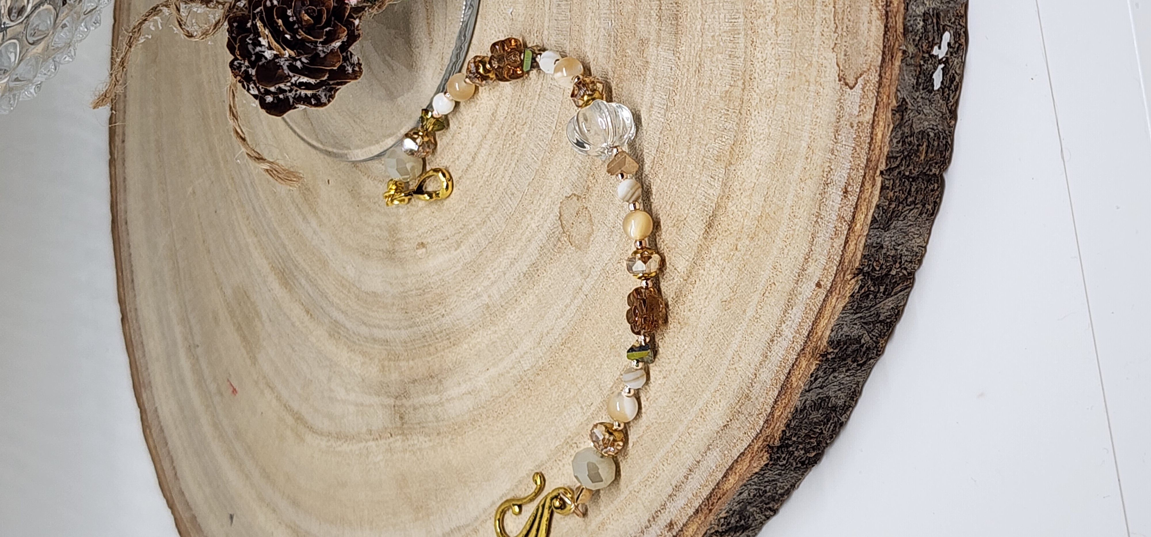 Soft neutrals meet warm gold tones in this elegant, one-of-a-kind beaded bracelet ✨ Designed to be timeless and easy to wear, this handmade bracelet features a beautiful mix of faceted glass beads, creamy white and beige tones, bronze accents, and a delicate gold hook and eye clasp for a meaningful finishing touch.