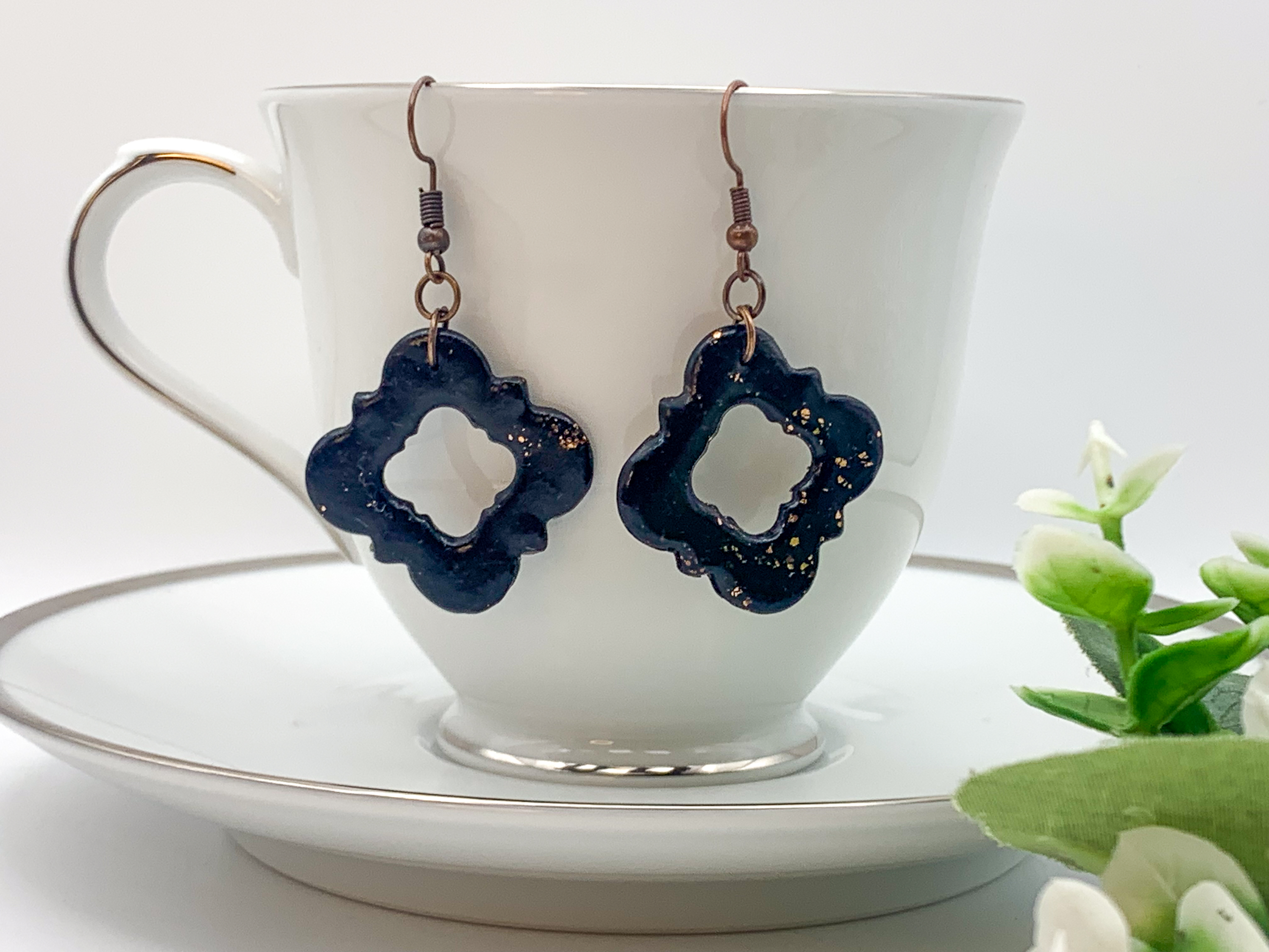 These navy quatrefoil earrings sparkle with golden flecks for a chic, timeless look. Perfect for adding elegance to any outfit! ✨