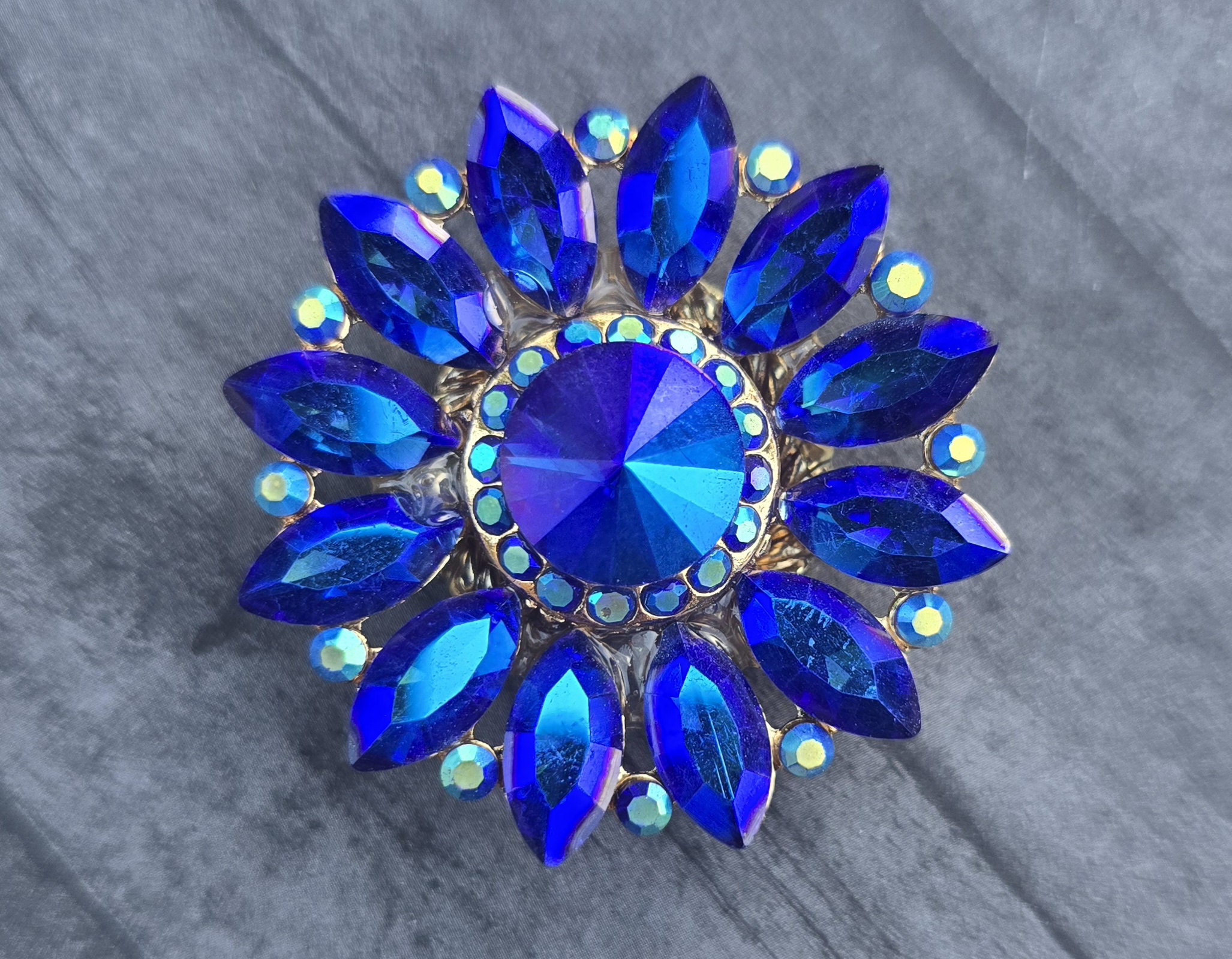 MAGNETIC BROOCH Beautiful Rivoli center crystal surrounded by Marquise-shaped crystals in Blue set in Gold-tone. Blue has a slight metallic hue, reflecting Royal Blue and Teal tones.. I took plenty of pictures to show the reflection of colors.