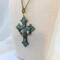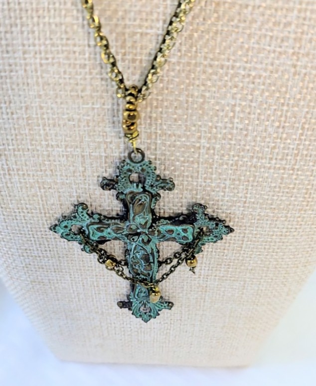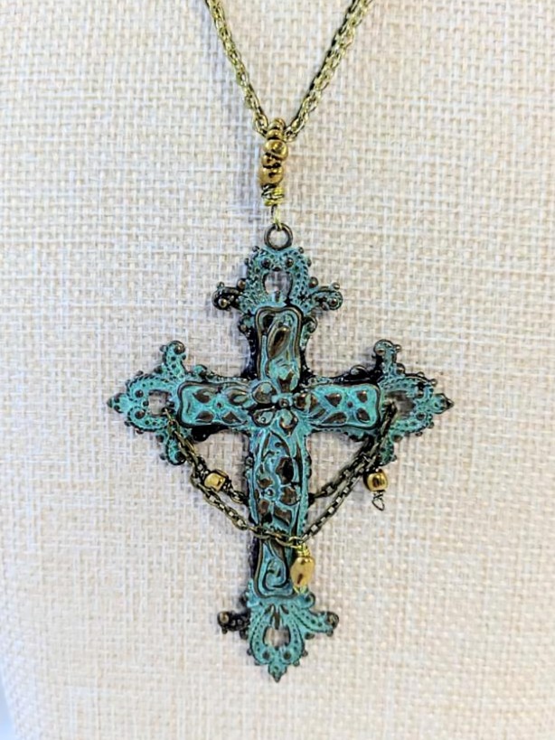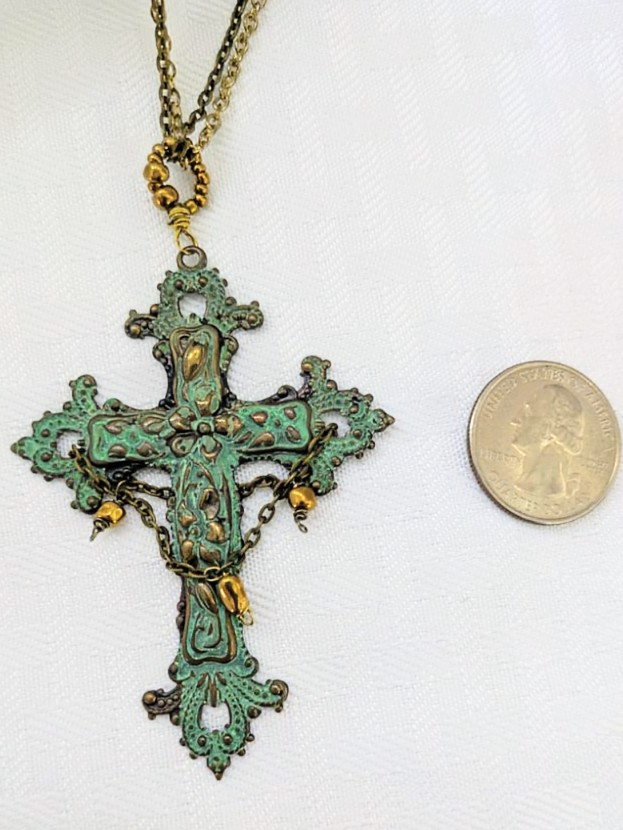 This statement necklace features Patina Brass Cross that is approximately 3" long by 2" wide. A chain detail graces the front and back of the cross with gold colored glass seed beads. Glass seed beads are used to make up the decorative bail.
