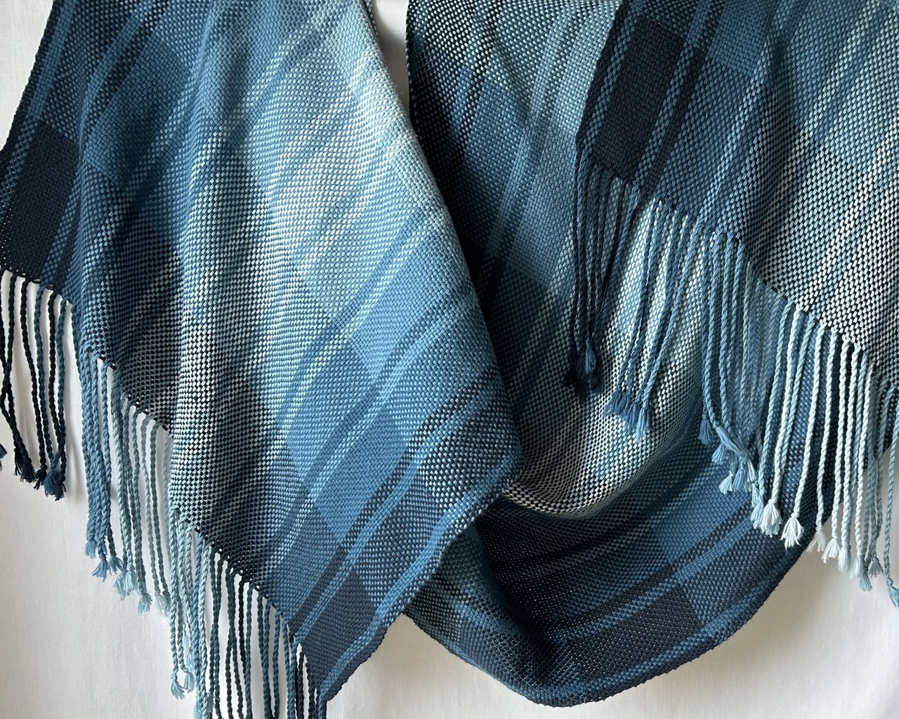 This incredibly soft drapey shawl was woven on my larger rigid heddle loom in five shades of 100% cotton yarn. This shawl is just the accessory your LBD needs for an outdoor or indoor event where the night air or AC is on the chilly side. In addition to the gradient changes drawing the eye in, the 6 inches of twisted fringe provides movement that also demands attention.