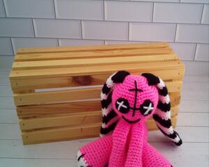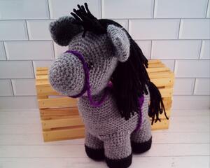Made with "Grape Fizz" acrylic yarn, he has a variety of purples throughout his clothing. He stands approximately 8 inches tall.
