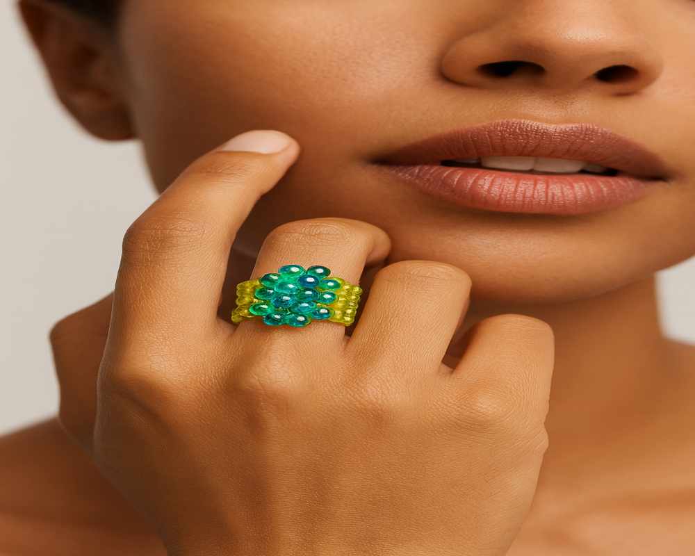 Playful and punchy, this ring features a lime green base with glowing teal bead bubbles. Handmade to add fun to your fingertips — wear it when you’re feeling bold and breezy.