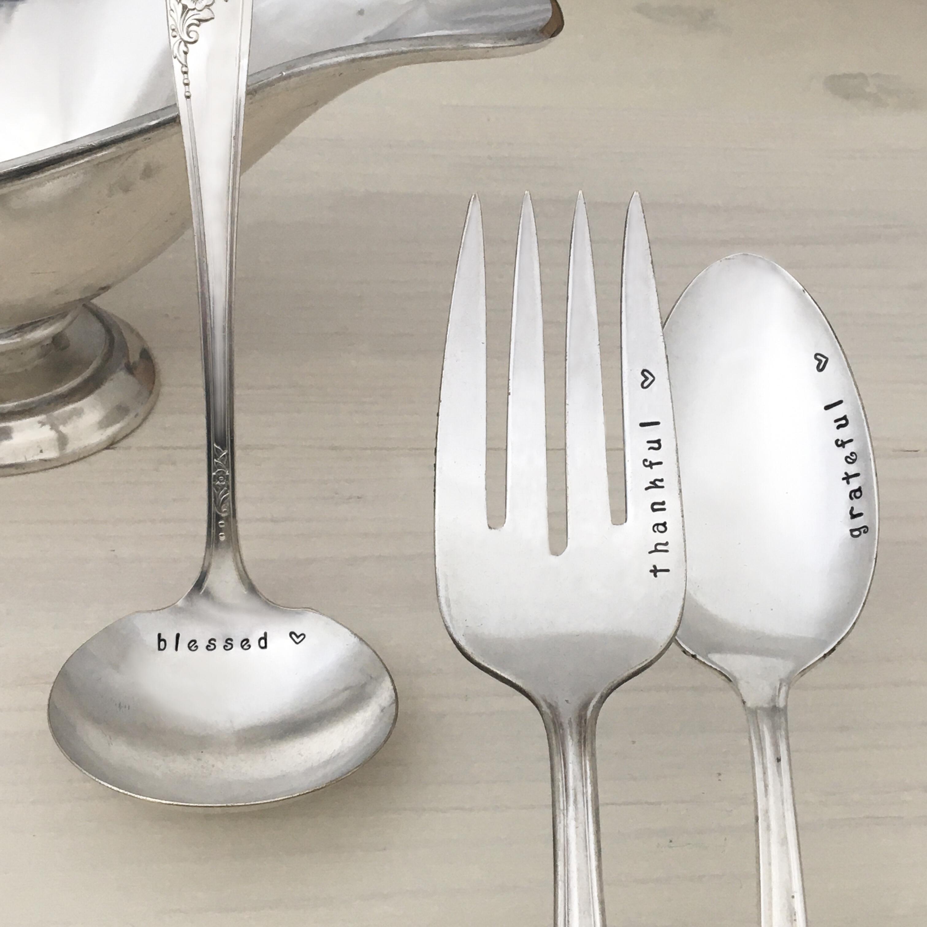Prose & Polish offers upcycled and repurposed vintage silverplate flatware. Each piece created is truly vintage - carefully curated through estate sales, antique shops, and auctions. They aren’t perfect, they will show their age — but their age and history are part of what makes them beautiful ❤ Once home, they are carefully cleaned and polished by hand. The sentiment is stamped letter by letter into the silver with a hammer and anvil. Hand stamping is a very old craft, done with a hammer, anvil and steel stamps. Each letter is hammered individually into the silver. There may be slight variances in the spacing and depth of the lettering. It is intentional and yields a hand crafted, artistic look befitting the vintage silverware. Hammering into the front of the silverware will leave a small mark on the back. This is not a defect, but rather a sign of a well crafted piece — like the knots on the back of embroidery or the stitching on the back of a quilt. I hope you see this and know that every letter on your silverware was lovingly placed there. May it bring joy to your table!