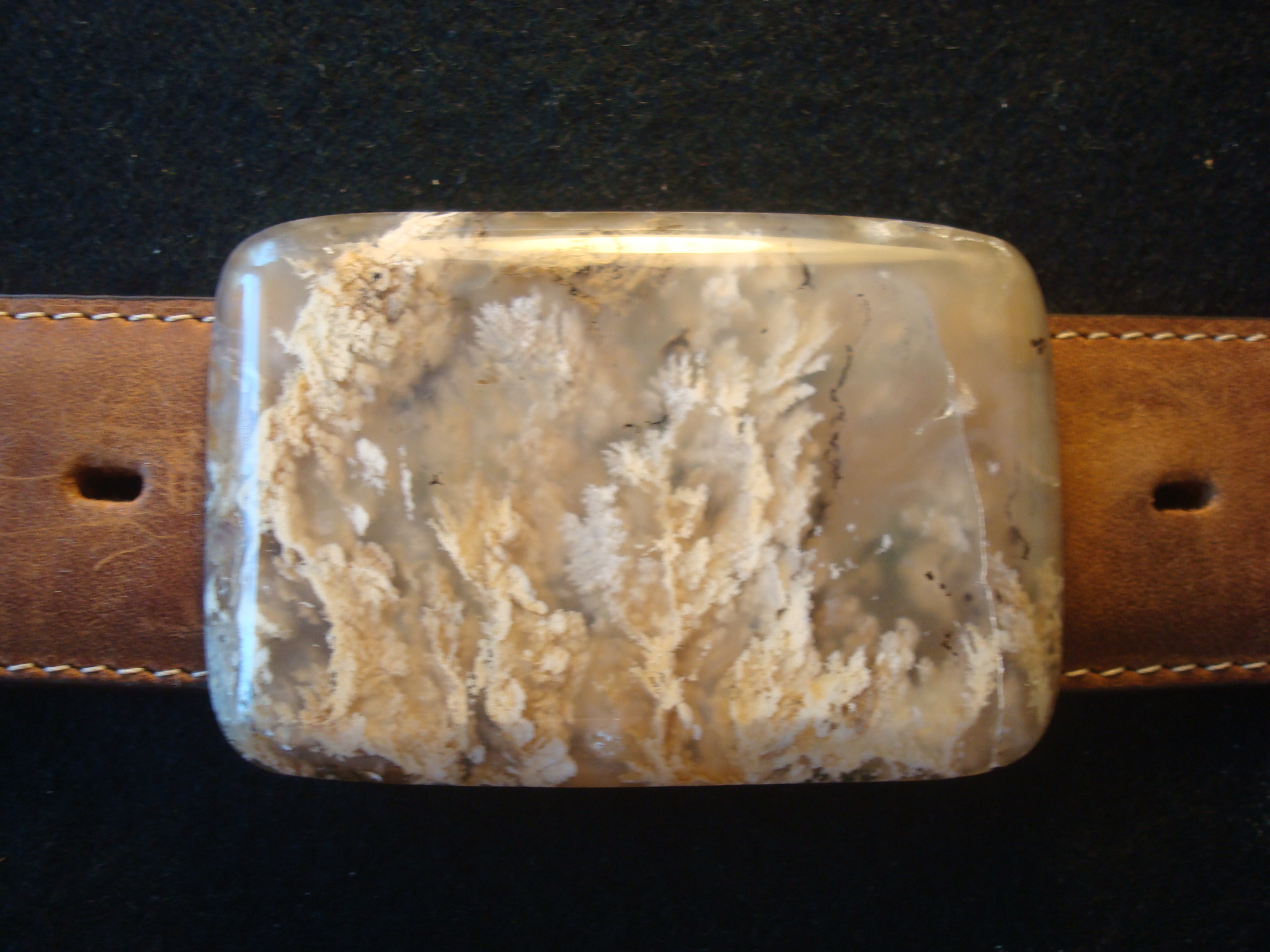 This variety of agate is found on the border of Idaho and Oregon and is a very beautiful and prized mineral. The buckle is formed in my beveled edge design and it measures 3'' by 2'' and will accept a belt up to 1 1/2" in width.The stone is supported with my handmade German Silver backing which is signed,dated and has the gemstone identified on the backing also.Please note that German Silver is not a true silver but an alloy comprised of nickle,brass and zinc. I use this for my backing because it is stronger,less expensive and it doesn't tarnish as does silver.