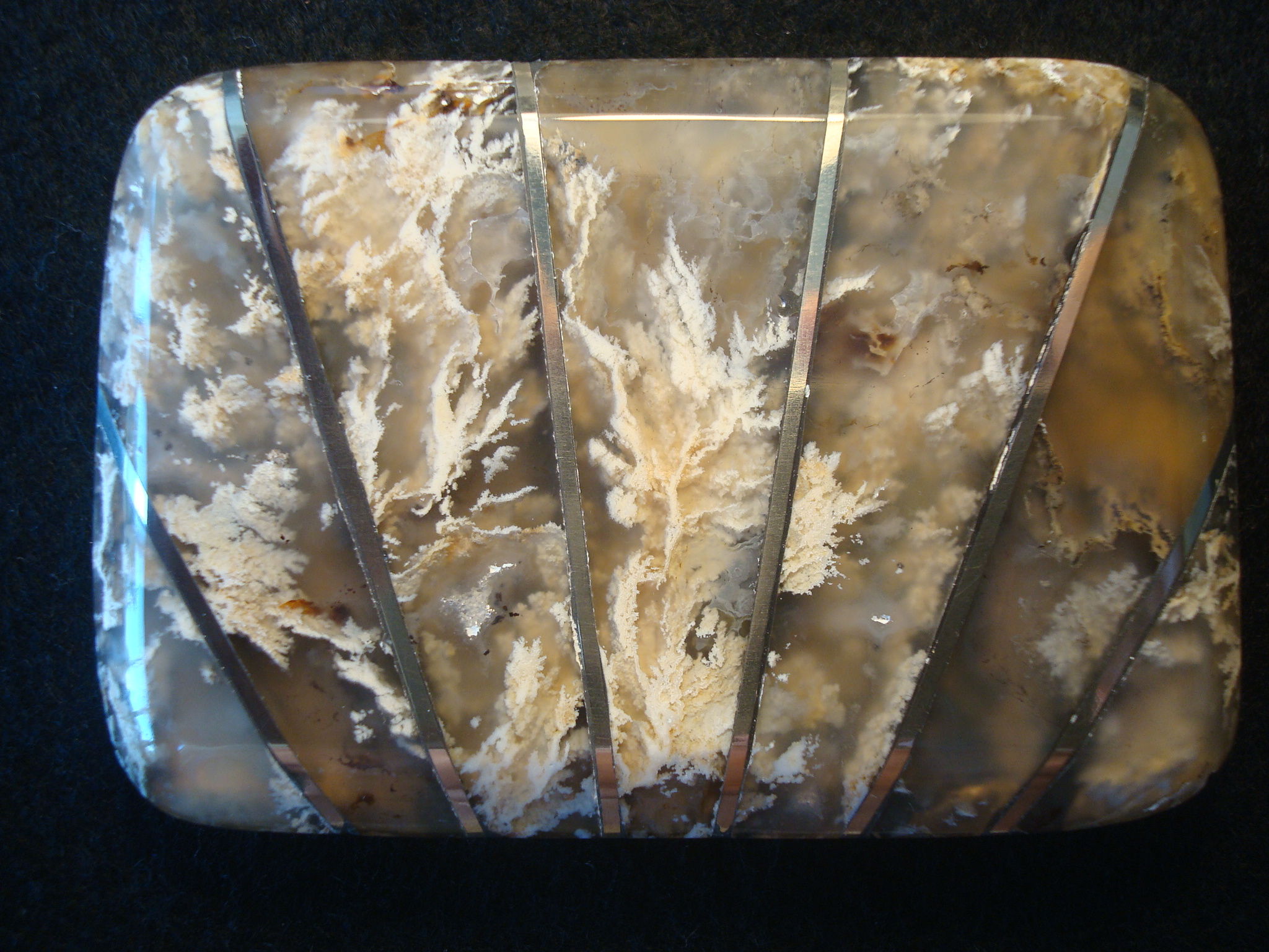 This variety of agate is found on the border of Idaho and Oregon and is a very beautiful and prized mineral. With this buckle I have taken seven pieces of this agate and accented them with veins of silver. The buckle is formed in my beveled edge design and it measures 3 1/16'' by 2 1/16'' and will accept a belt up to 1 1/2" in width.The stone is supported with my handmade German Silver backing which is signed,dated and has the gemstone identified on the backing also.Please note that German Silver is not a true silver but an alloy comprised of nickle,brass and zinc. I use this for my backing because it is stronger,less expensive and it doesn't tarnish as does silver.