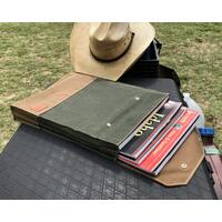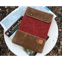 An Overland Map and Atlas Bag, made with the highest quality waxed canvas, UV resistant nylon thread, and solid brass snaps. The eco friendly wax, impregnated into the fabric, naturally repels water, and earns a patina with wear marks, much like leather, with every adventure. Handcrafted with good intention and an eye for the details, this soft storage case will last for years. Proudly carry this stout and rugged bag, made in nature, in a tiny workshop on wheels!