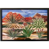 This striking mosaic is made with hand cut glass pieces and five different grout colors, and framed in an elegant black wooden frame.