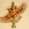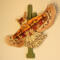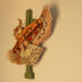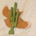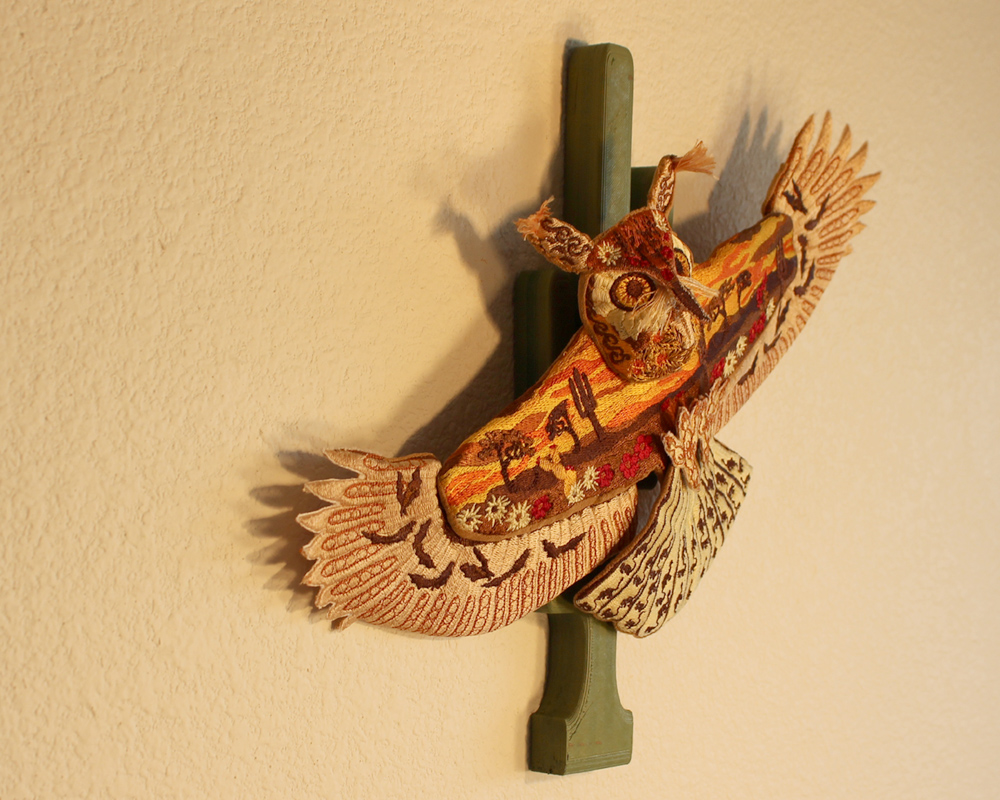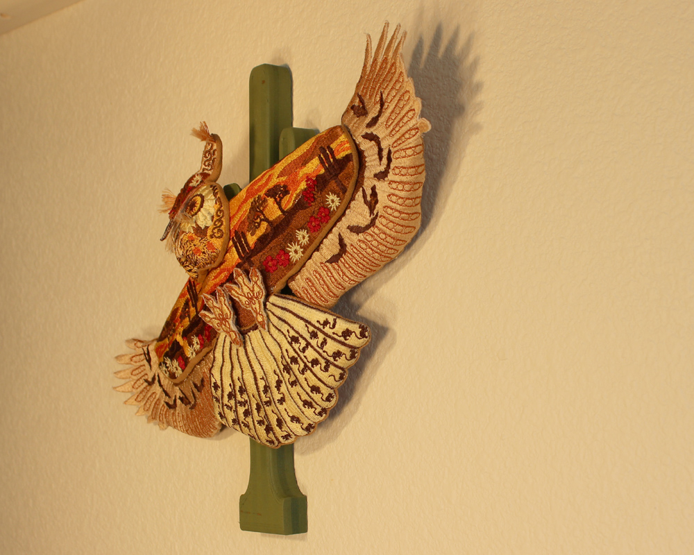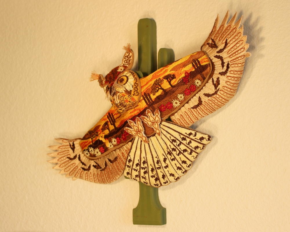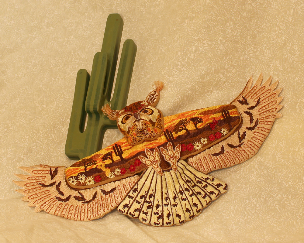 This dramatic embroidered piece was inspired by the Great Horned Owls found soaring in the Sonoran Desert and around my home in Why, AZ. Great Horned Owls Hawks are majestic and beautiful creatures! This owl is adorned with a desert landscape in the golds and browns colors of dusk, with creatures of the night decorating the wing and tail feathers. The “Who Are You? Who? Who?” piece would be a dramatic display on a wall with the included saguaro cactus display.