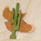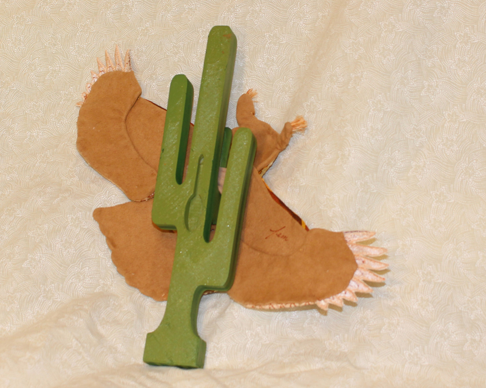 This fiber statue is machine embroidered from a design that I created. The embroidered pieces are then machine sewn and hand stitched to complete it. The owl is lined with a soft fabric with a loop to hold the piece onto the saguaro display.