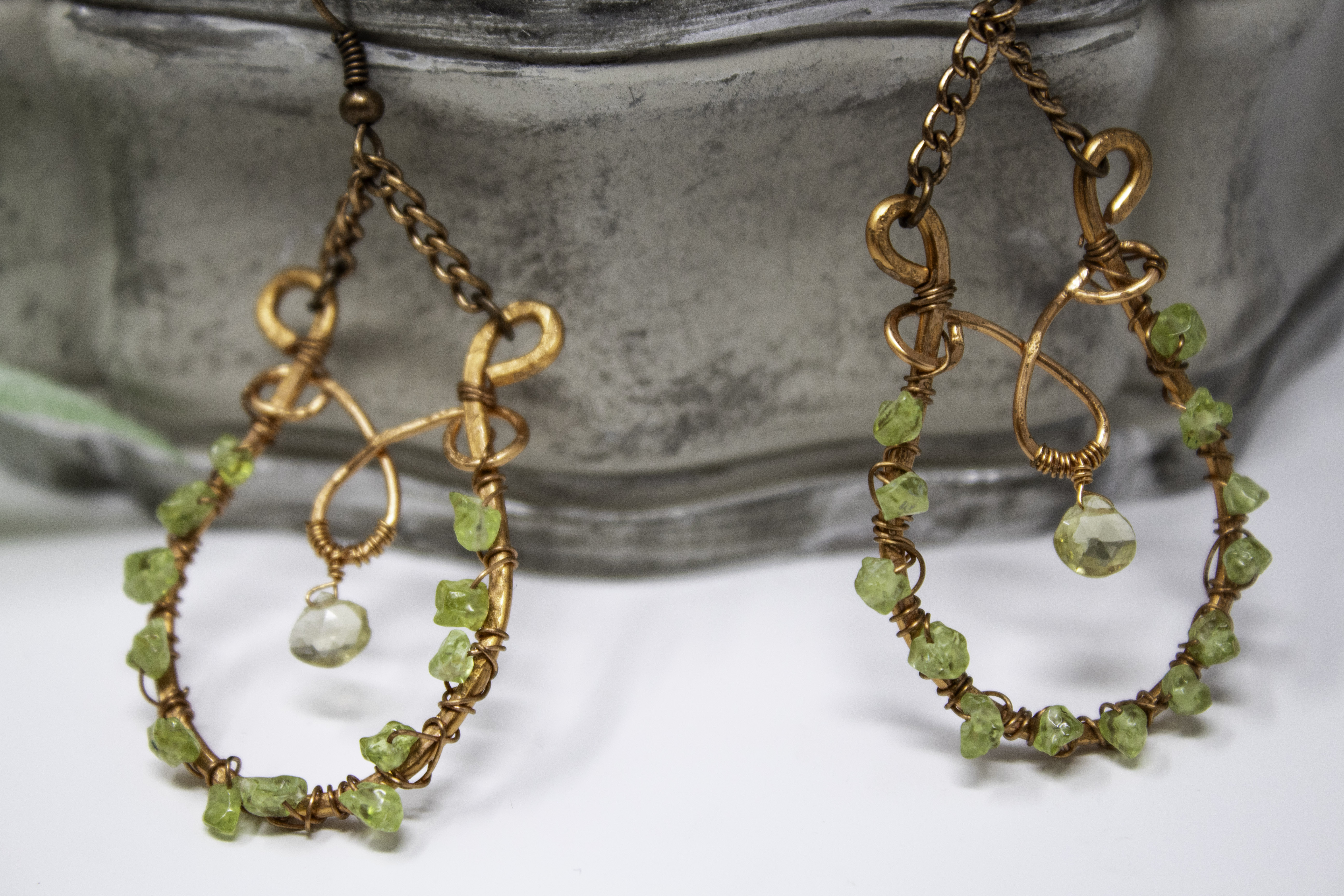 Grecian Hammered Copper Chandelier Earrings with Peridot and Lemon Quartz – Boho Goddess Statement Jewelry