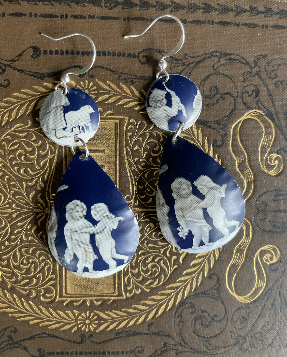 Nothing hits like the classics. And I'm referring, of course, to the ancient classical aspect of "classics." A couple of cherubs discuss who to next hit with their arrows of love. The small dings in color of the tin are due to the antique (used) nature of the tin I used to make this jewelry. These silver-plated earrings have rubber stoppers on the back so they won't fall out of your ears.
