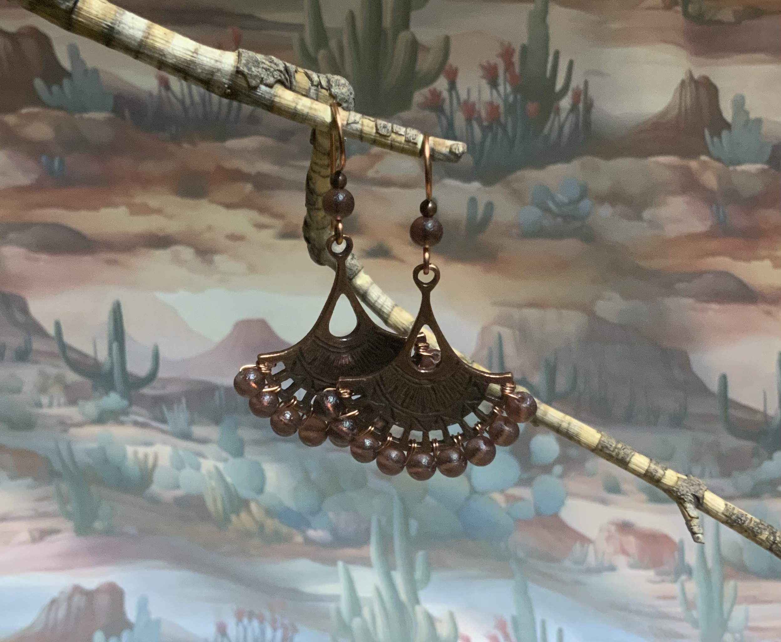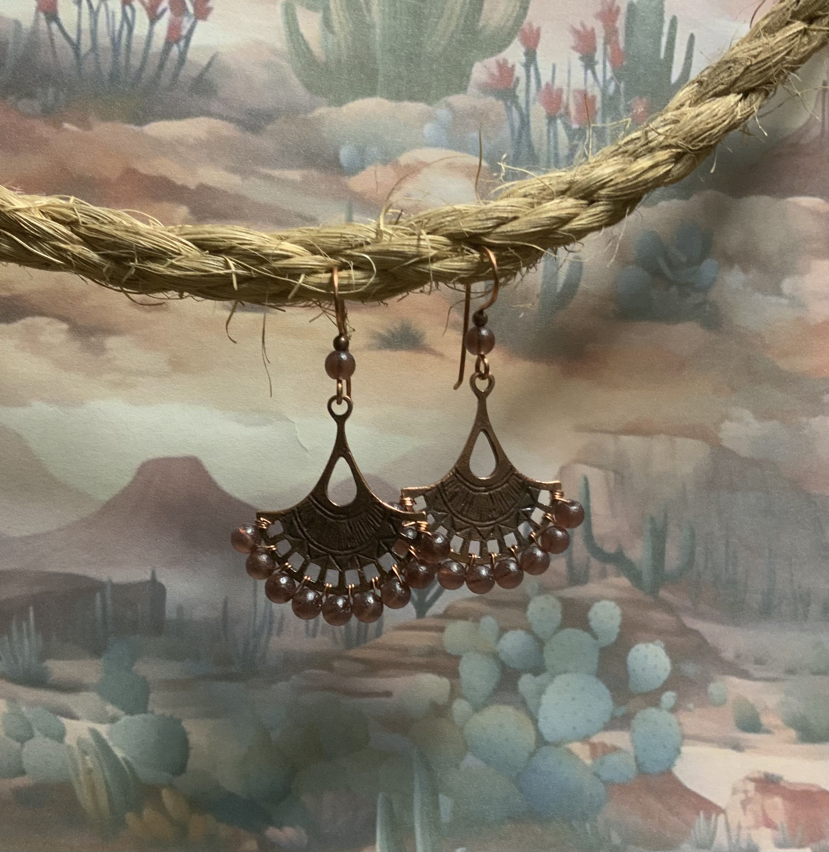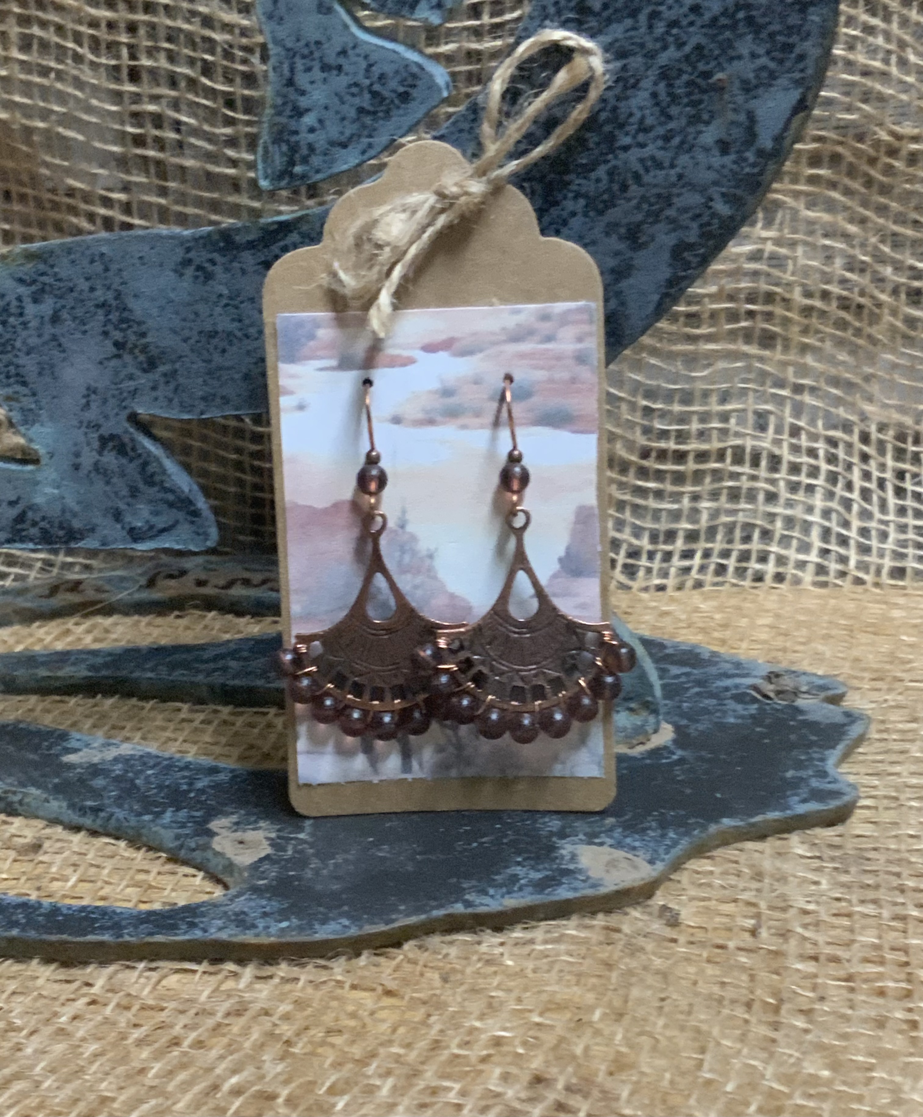 These earring have handmade copper ear wires with 4mm amethyst Beach-Style glass beads. The fan drop is Mykonos Greek plated copper. I wire wrapped the amethyst glass beads below the fan, making the two colors compliment each other. Each pair of earrings comes displayed on a handmade card.