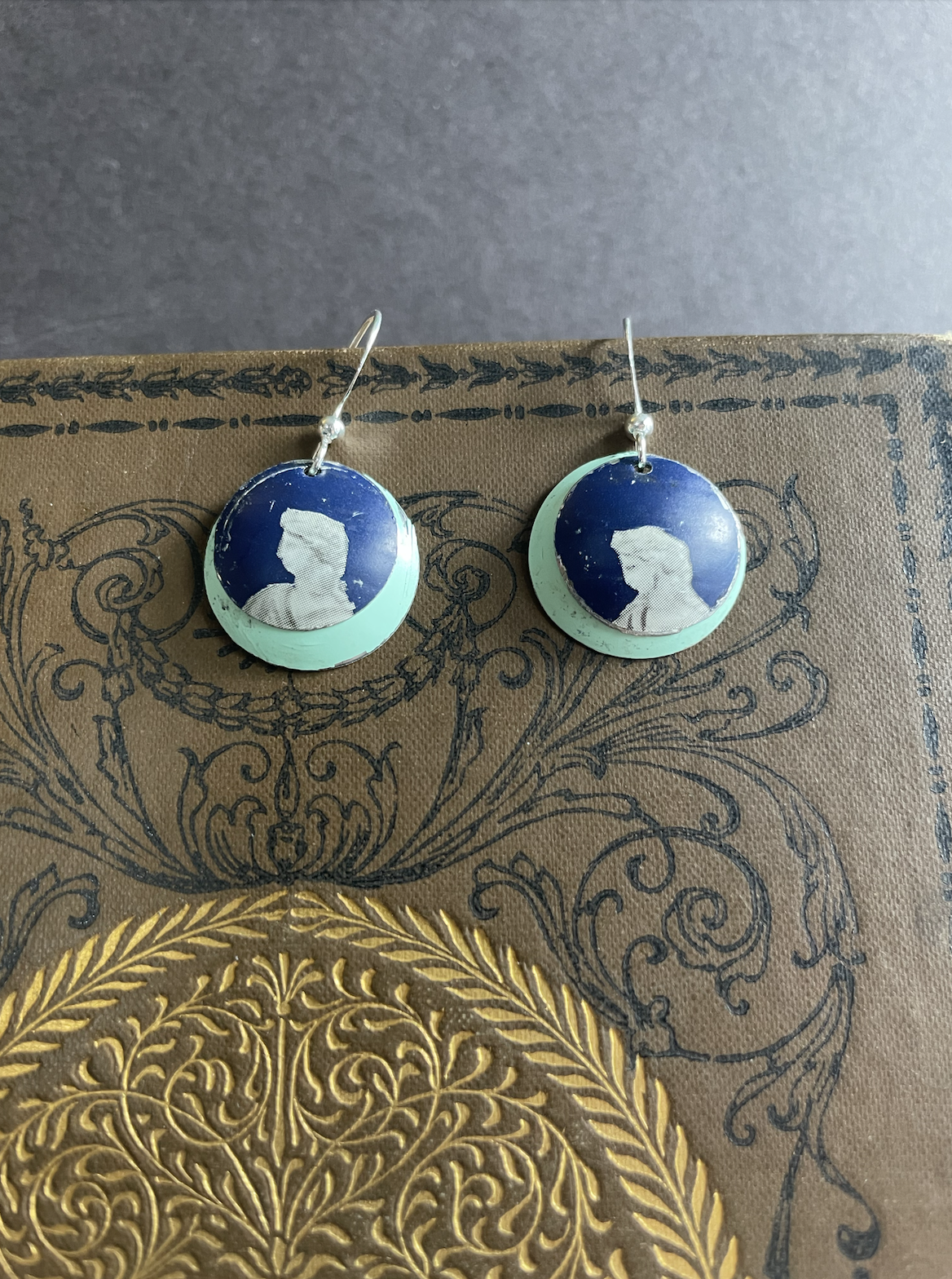 Nothing hits like the classics. And I'm referring, of course, to the ancient classical aspect of "classics." A small marble head affixed on these earrings looks lovely against the minty green background. The small dings in color of the tin are due to the antique (used) nature of the tin I used to make this jewelry. These silver-plated earrings have rubber stoppers on the back so they won't fall out of your ears.