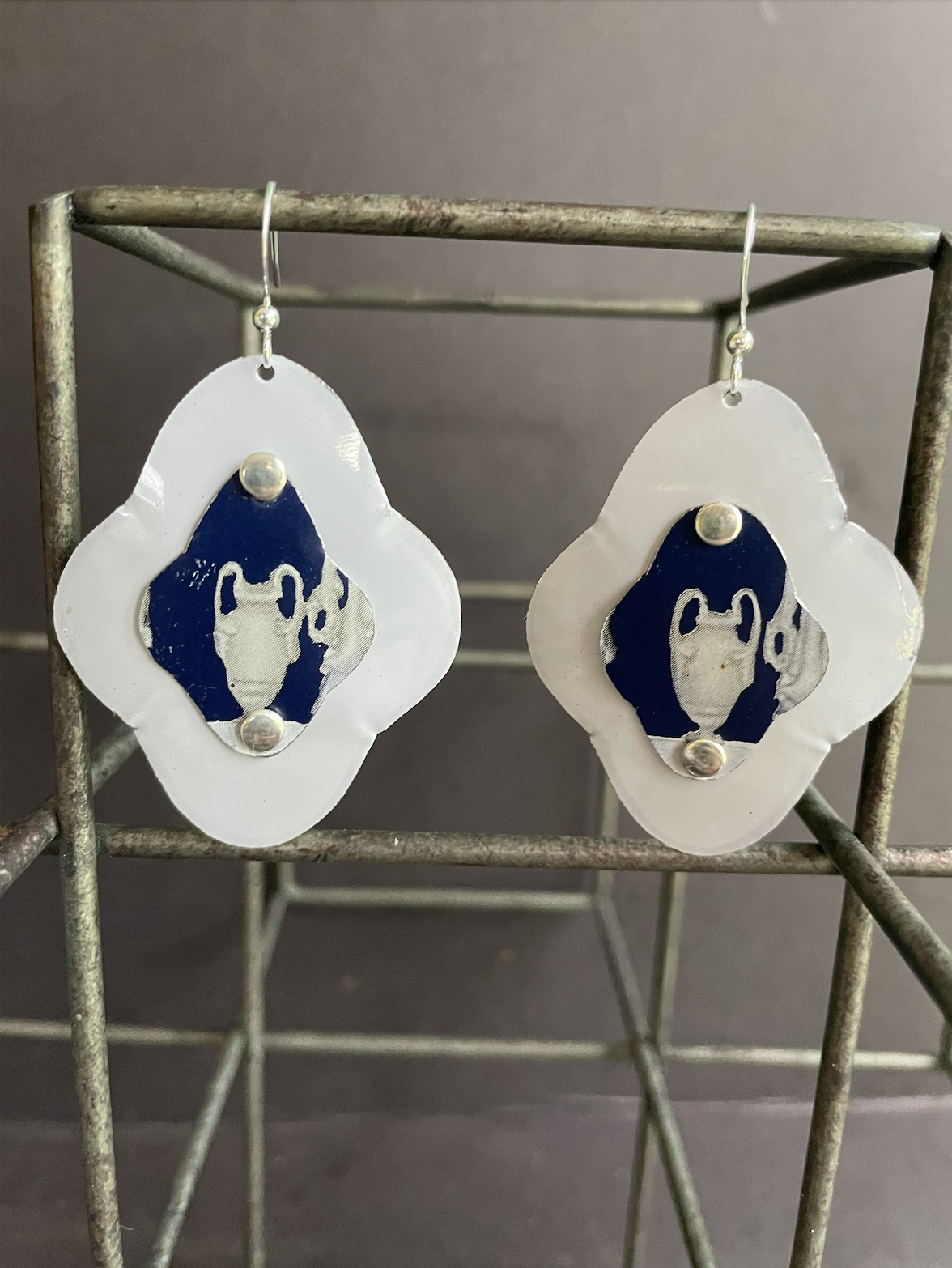 Nothing hits like the classics. And I'm referring, of course, to the ancient classical aspect of "classics." Do you remember the part in The Music Man when all the older ladies are dressed in togas and are creating a tableau and they call for "Grecian Urn"? That's what I think of when I see these. The small dings in color of the tin are due to the antique (used) nature of the tin I used to make this jewelry. These silver-plated earrings have rubber stoppers on the back so they won't fall out of your ears.