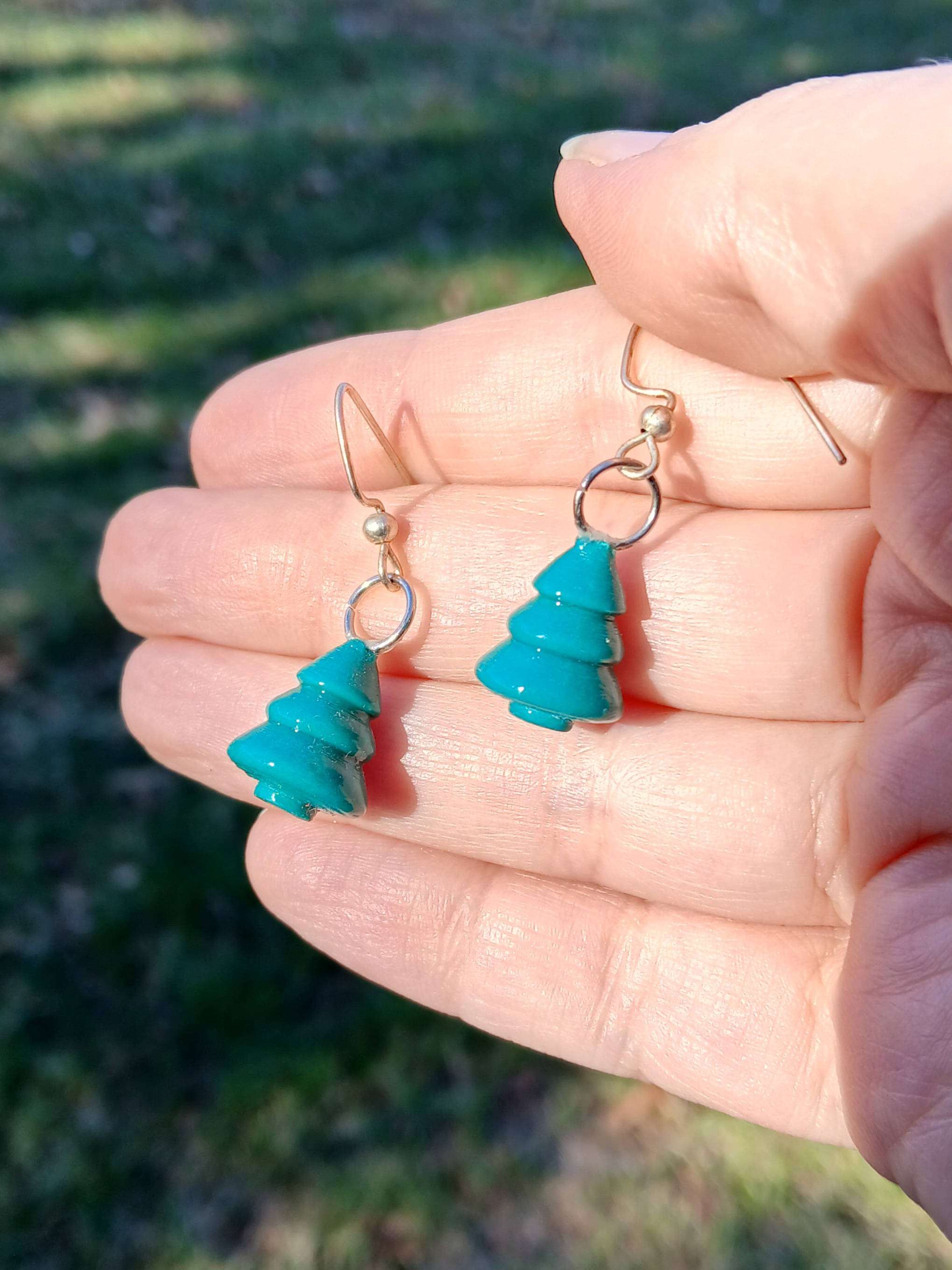 Spruce green polymer clay was = pressed into a ball and rolled into a 3D tree shape. The baked beads were then coated with UV resin and assembled into earrings.