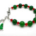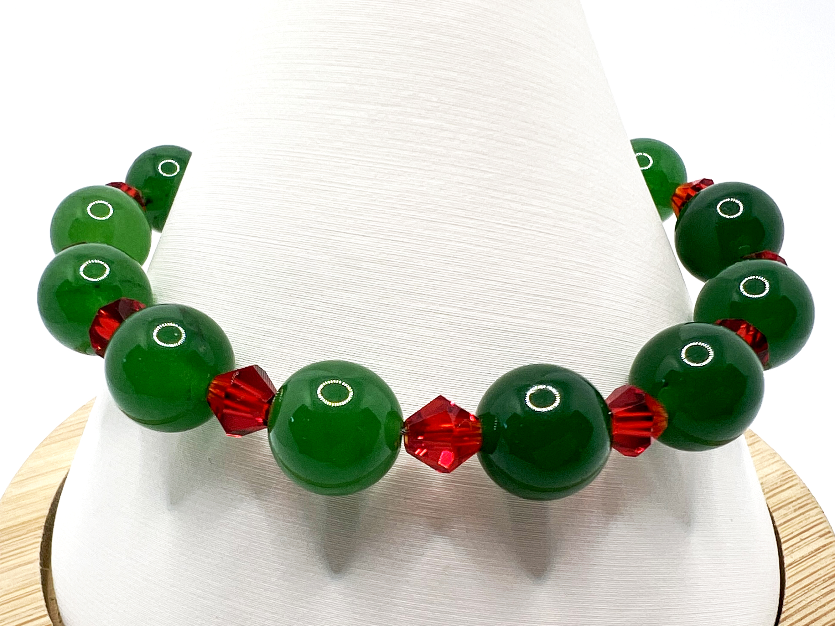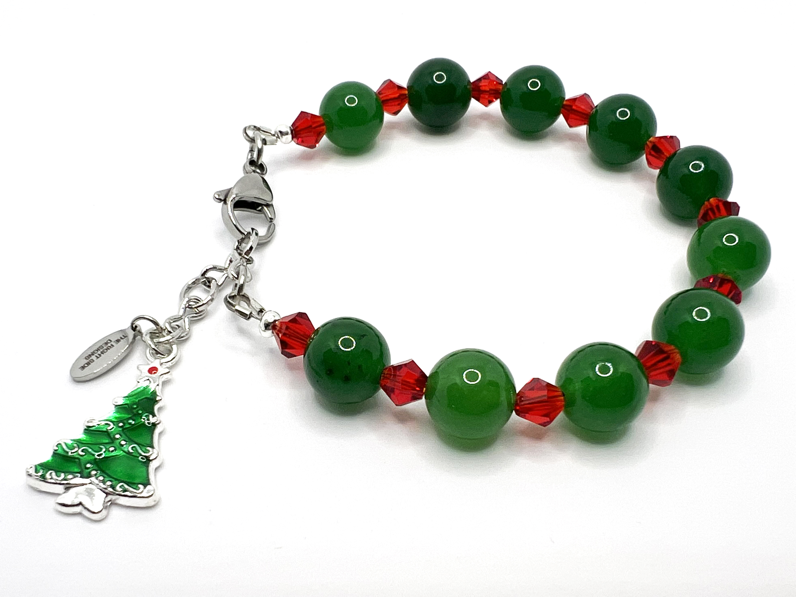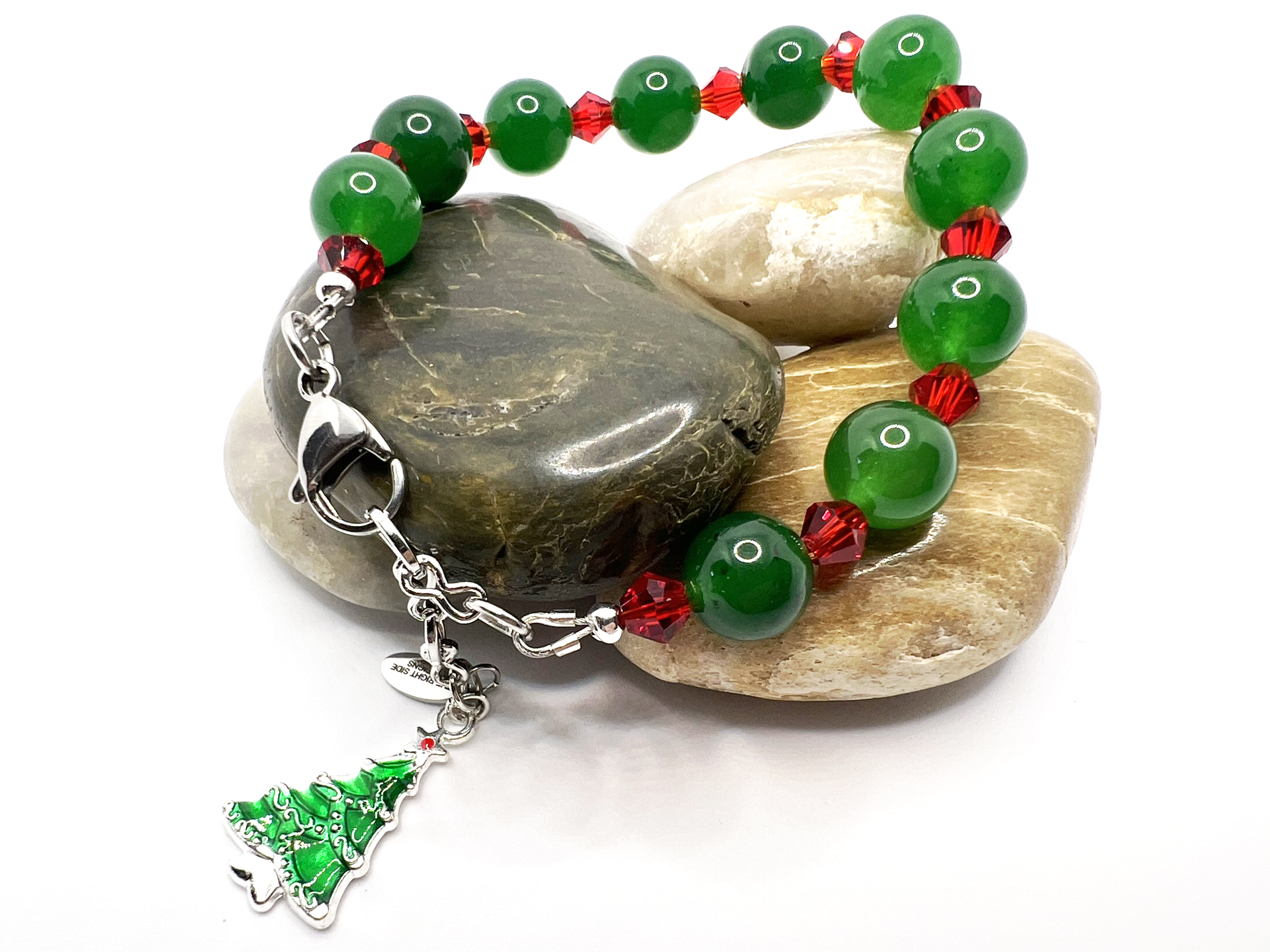 Bring holiday cheer to your wrist with this elegant Christmas bracelet featuring 10mm polished green agate beads paired with sparkling 6mm red crystals. A charming 24mm Christmas tree charm adds a playful seasonal touch, while the silver-toned lobster clasp ensures a secure fit. Adjustable for comfort, this piece is perfect for holiday parties, gifting, or simply celebrating the season in style.