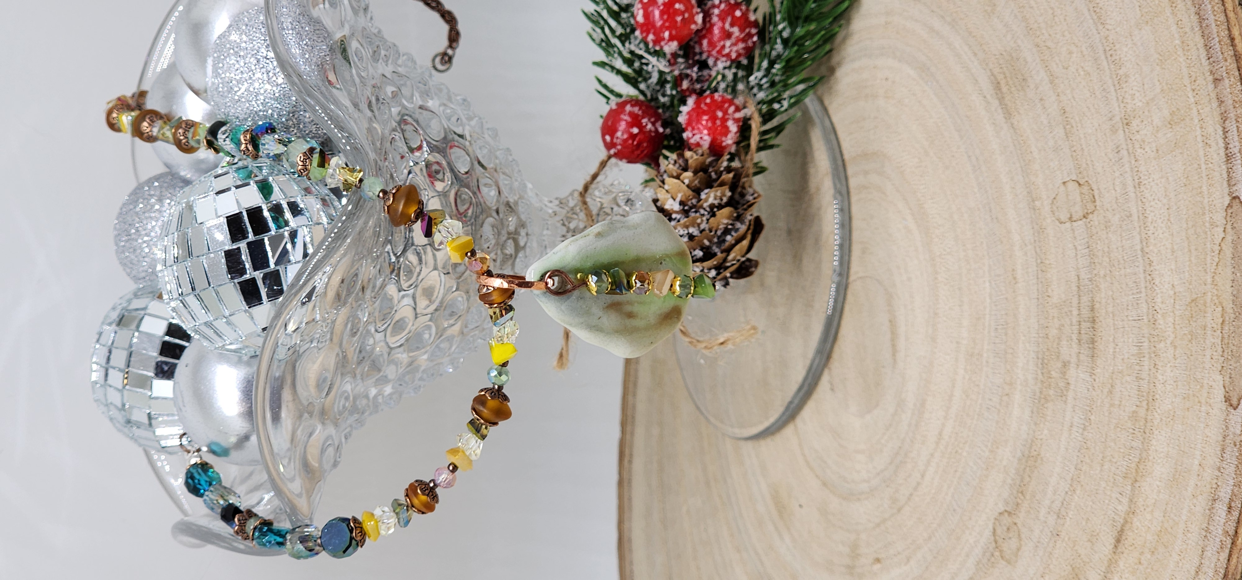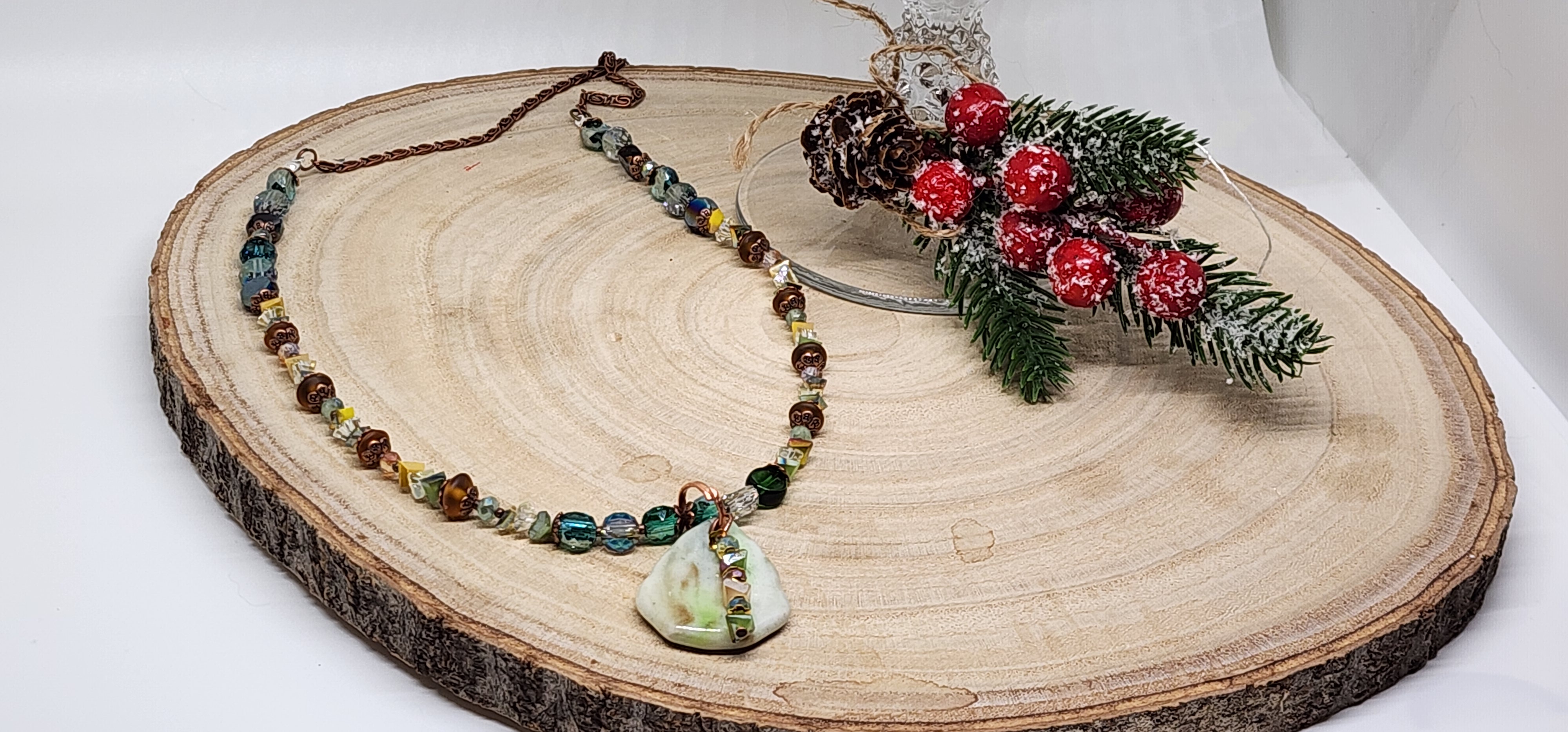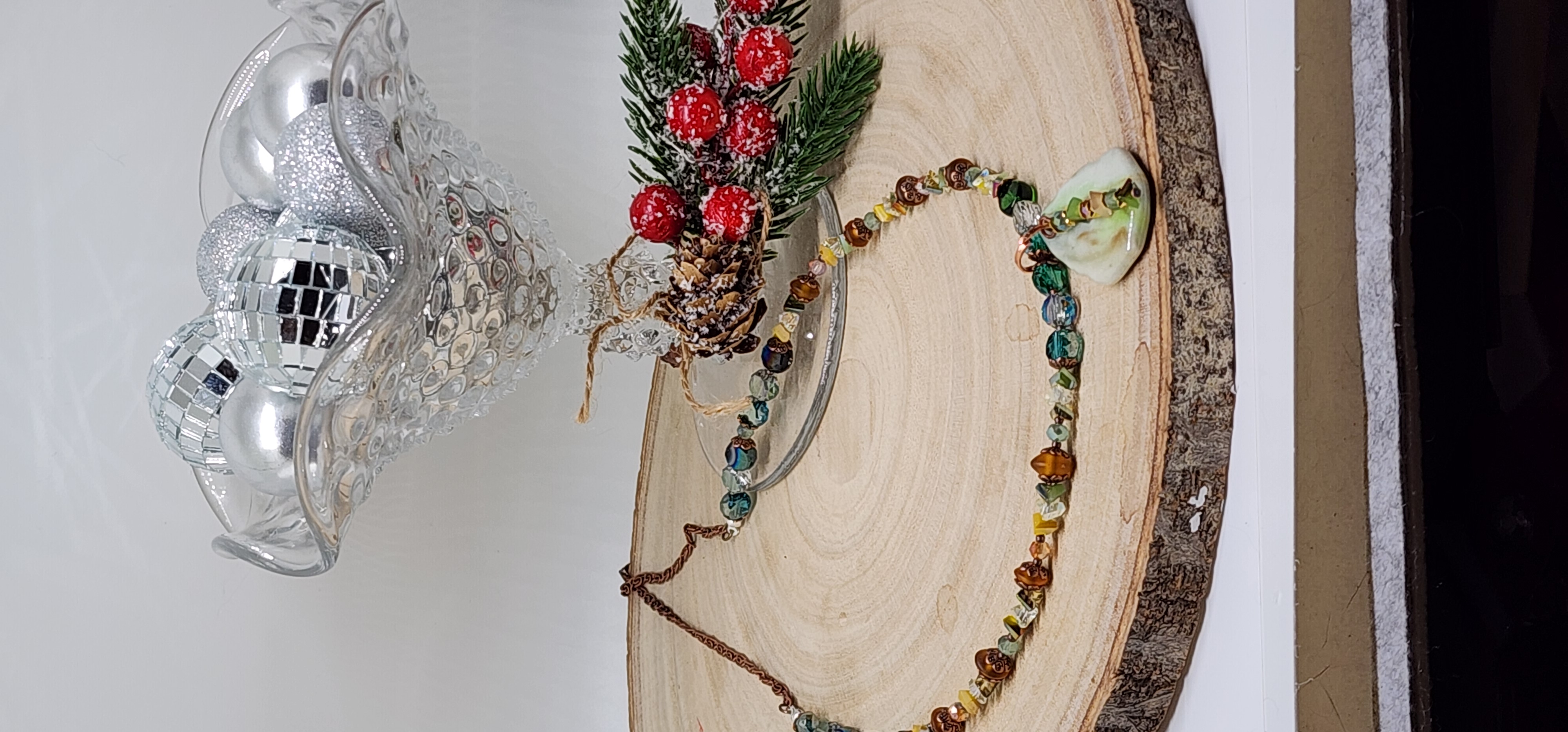 Step into the magic of the forest with this handcrafted green agate leaf pendant necklace – a one-of-a-kind piece that blends earthy elegance with festive charm. The polished green agate pendant, shaped like a delicate leaf, evokes the serenity of winter woods and the sparkle of holiday gatherings. Accented with a mix of metallic, glass, and ceramic beads in rich seasonal hues, this necklace is a celebration of nature’s beauty and artisan craftsmanship.
