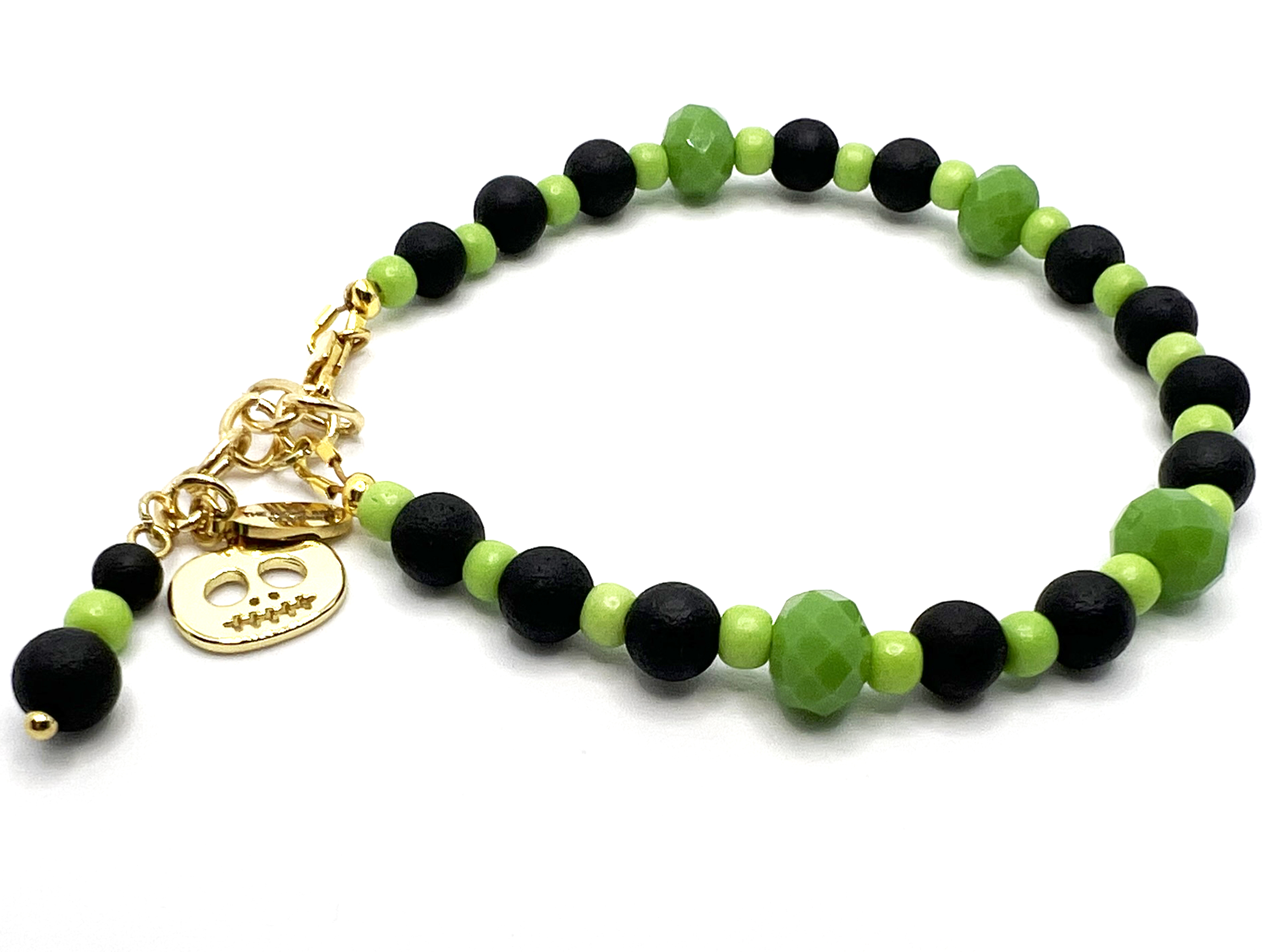 This bold Halloween bracelet mixes edgy and festive in one striking design. Featuring 6mm rough-hewn black glass beads paired with 8mm faceted lime green crystals, it’s accented by green glass seed bead spacers for extra pop. Finished with a gold-toned lobster claw clasp and a playful pumpkin charm, this bracelet is adjustable from 7-3/4 to 8-3/4 inches (M/L). A perfect statement piece to celebrate spooky season in style! ???