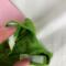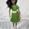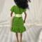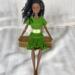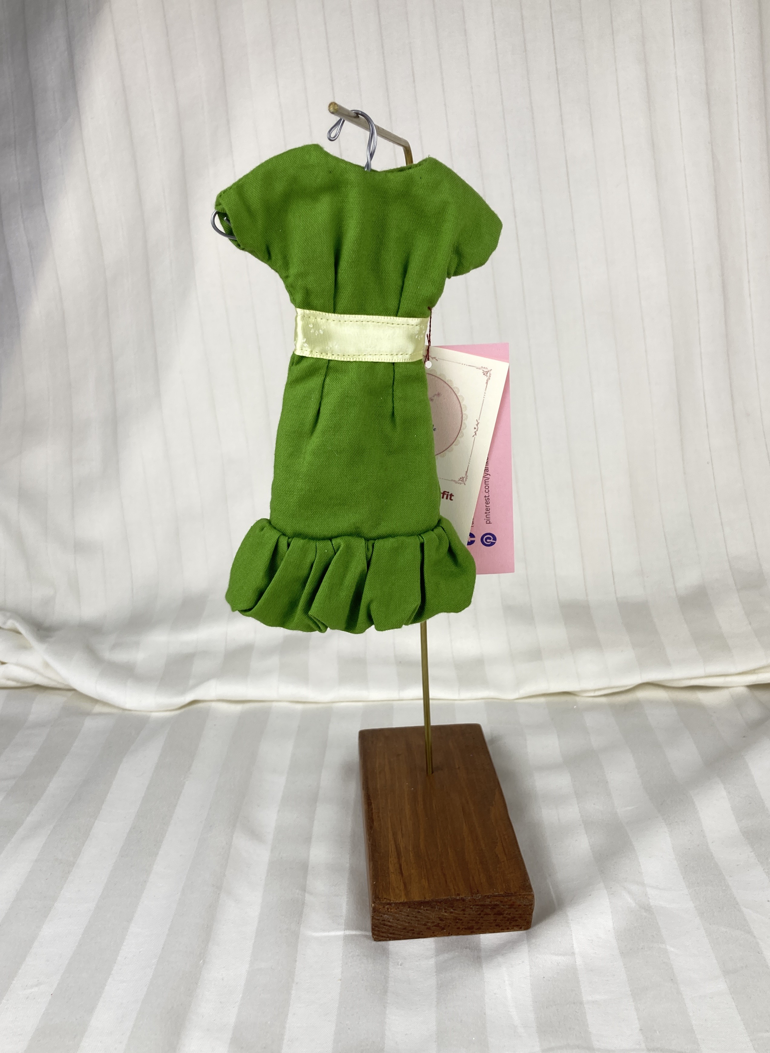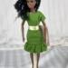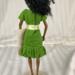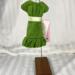 This shift style dress is made from green cotton fabric and has a hook and loop closure in back. The neckline is round and the sleeves are one piece style. The skirt hits below the knees and ends in a bubble ruffle. The yellow with tiny white flowers ribbon belt/sash is stitched on for ease of use.