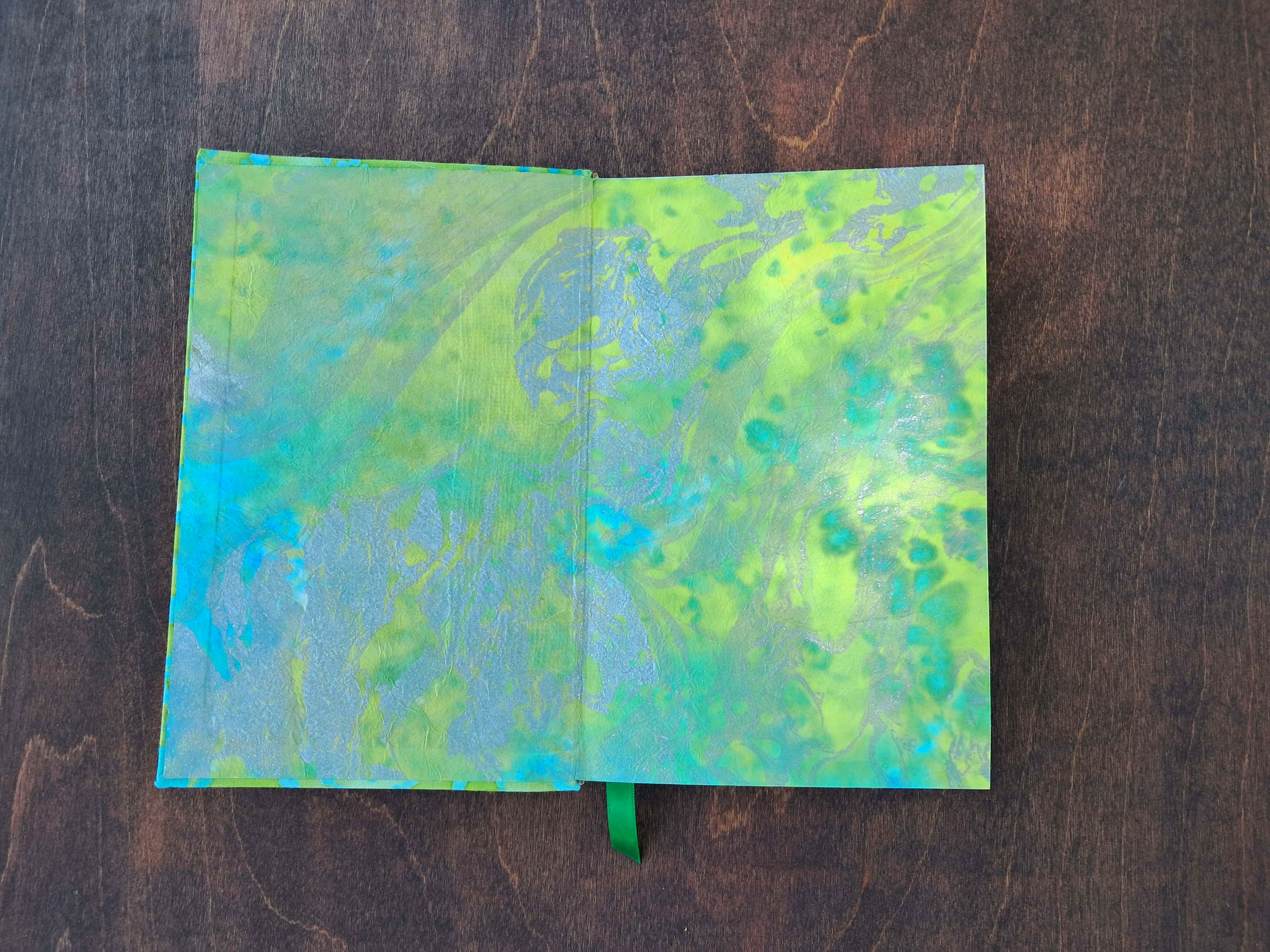 A handmade journal bound in batik fabric and Thai marbled paper. Contains 160 pages of lined 24lbs paper.