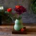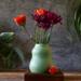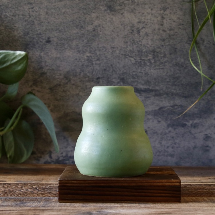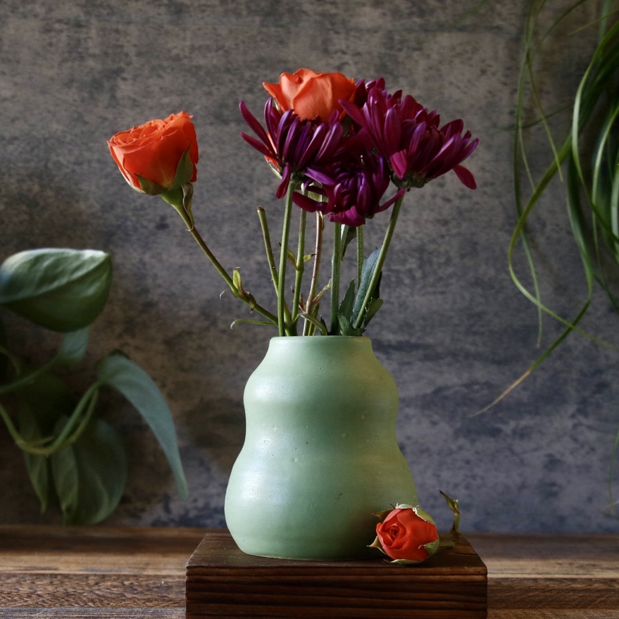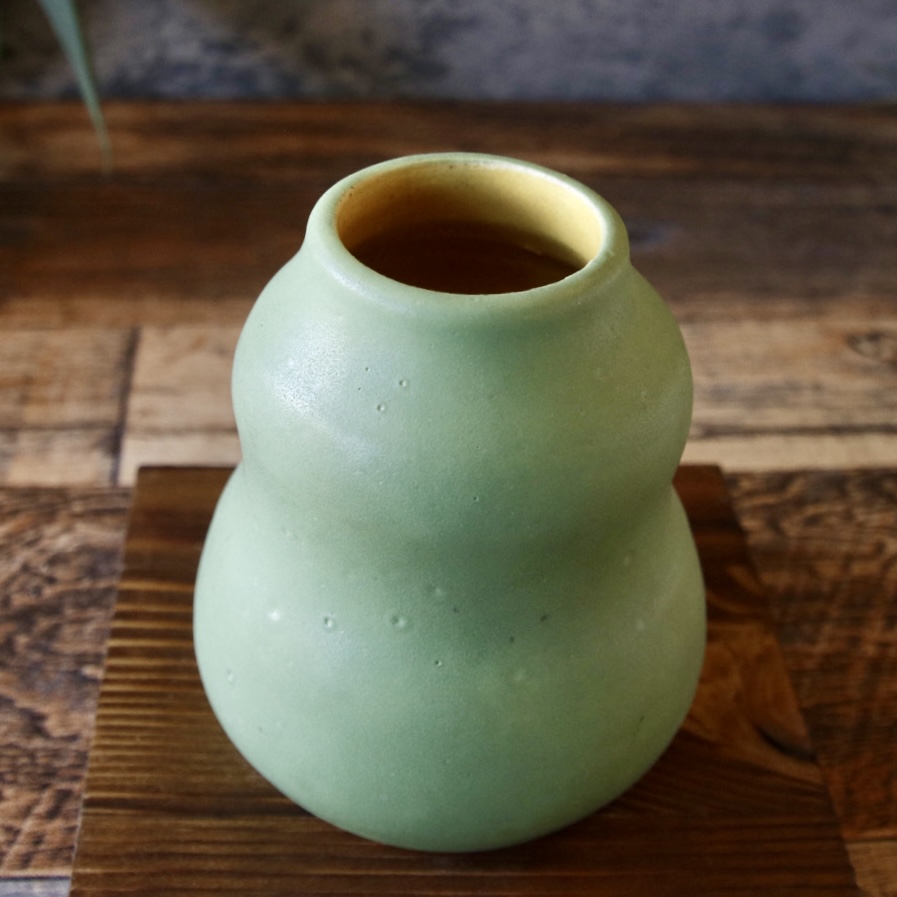 This sweet greet bubble vase has a peek-a-boo yellow interior. Perfect as a bud vase, or small bunches of flowers. The satiny green glaze is bright enough to give contrast to darker leaves, and bright, happy flowers.