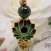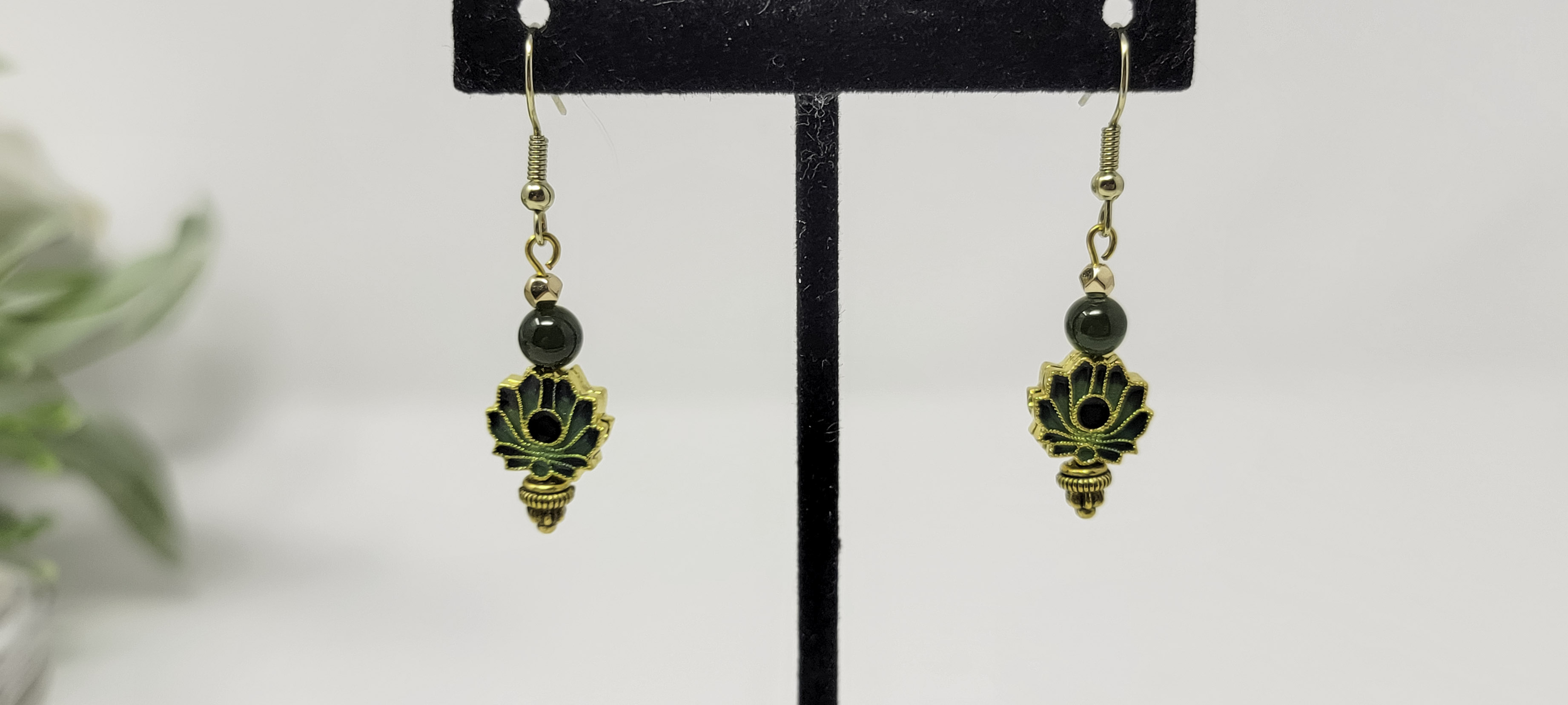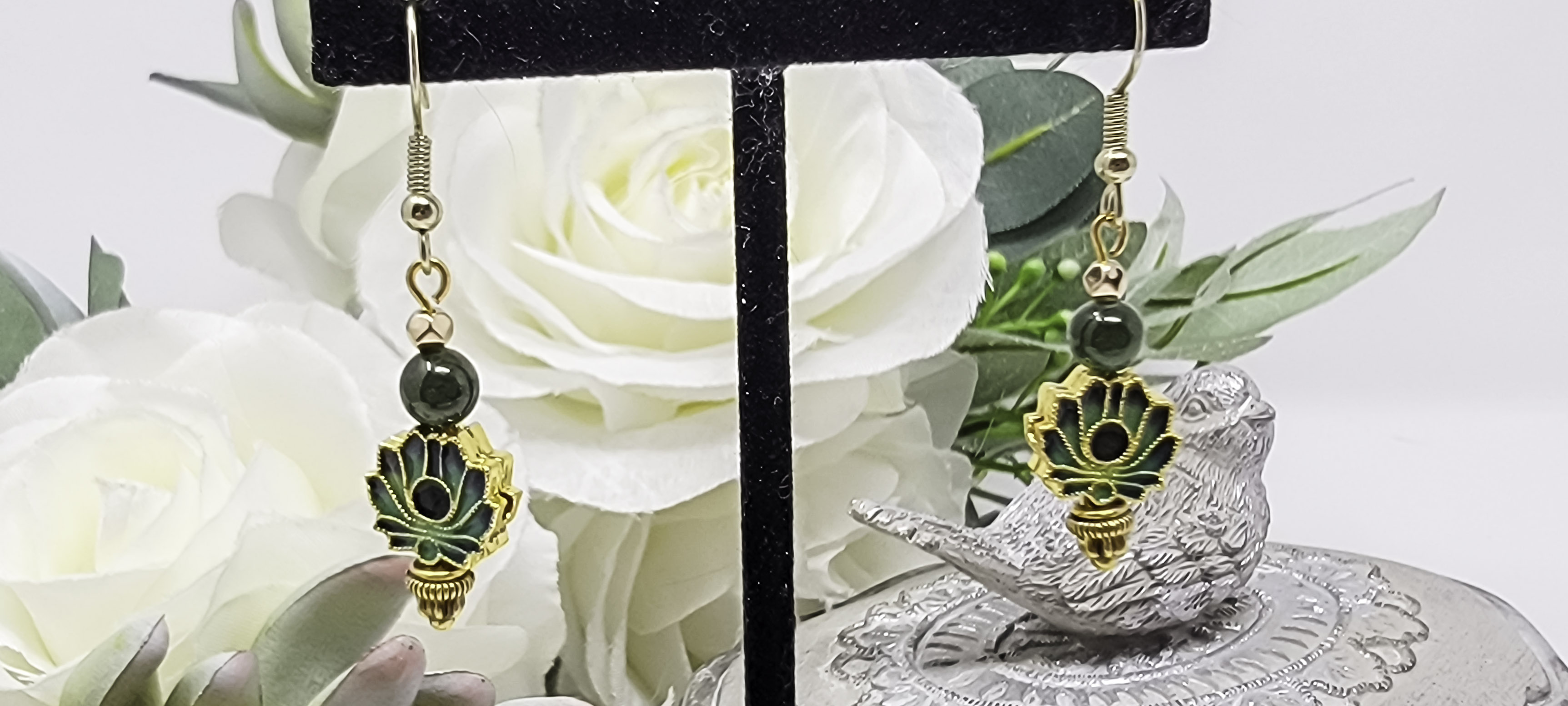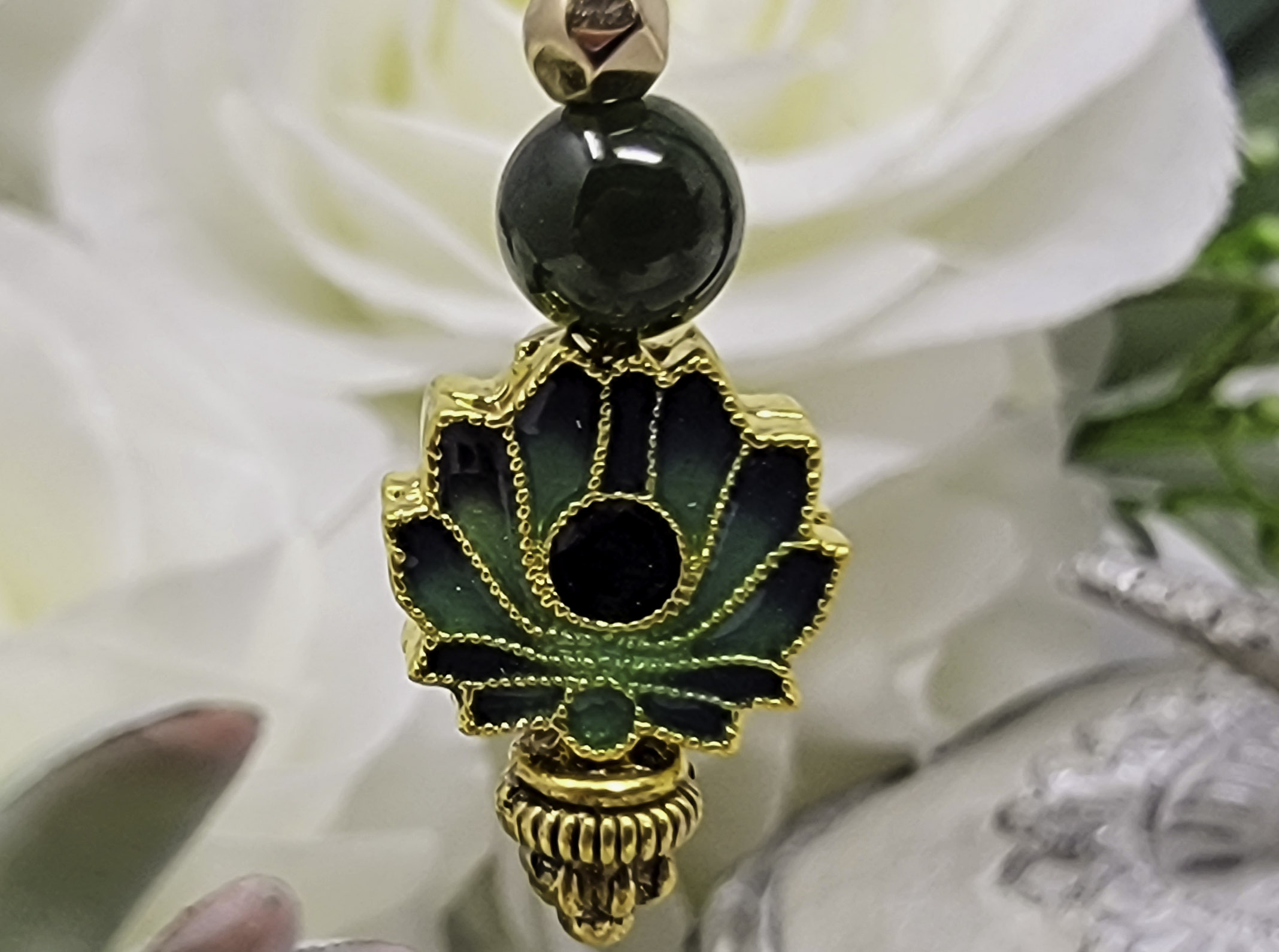 Embrace tranquility and timeless beauty with these green cloisonné lotus bead and jade accent earrings. Each earring features a delicately detailed cloisonné lotus bead—a symbol of purity, renewal, and spiritual growth—adorned with genuine green jade accents that radiate calm and harmony. The gold tone hardware adds a warm, elegant finish, perfectly complementing the serene green hues.