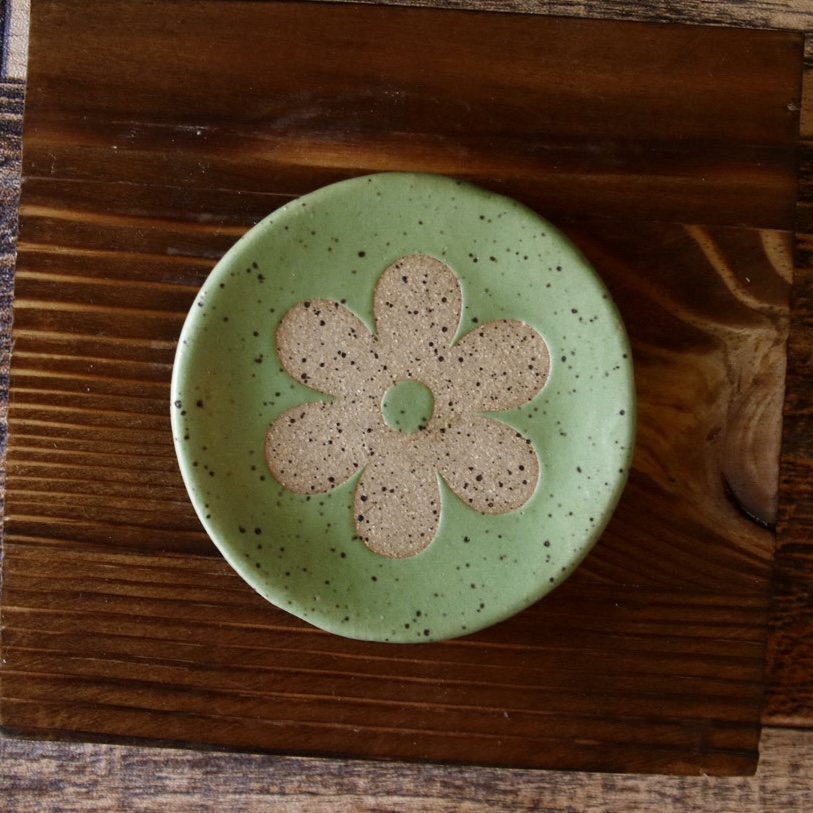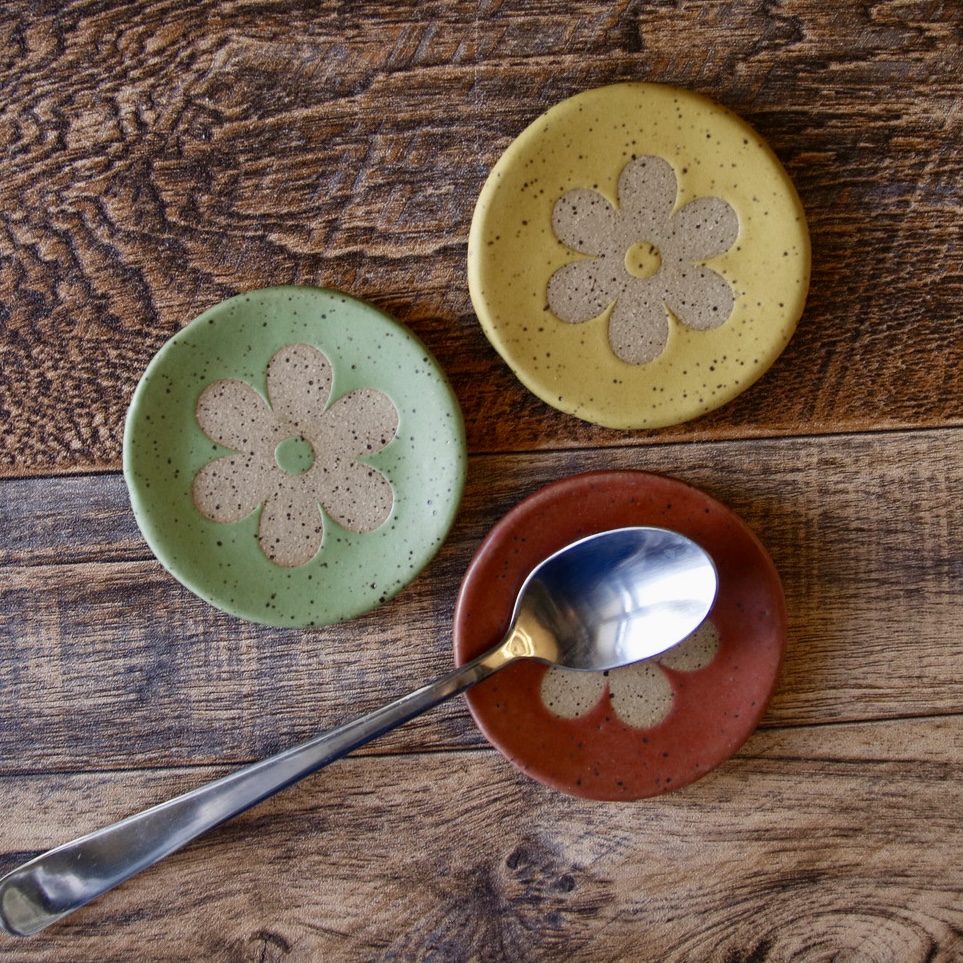 These sweet retro looking flower plates are perfect for use as trinket dishes, tea bag holders, or to hold your coffee spoon. They measure about 3 inches across. The glaze is satiny smooth, with the unglazed flower in brown contrast. It is microwave and dishwasher safe, and the unglazed portion is perfectly safe to rest a spoon. These match the Retro Green Flower Mug.