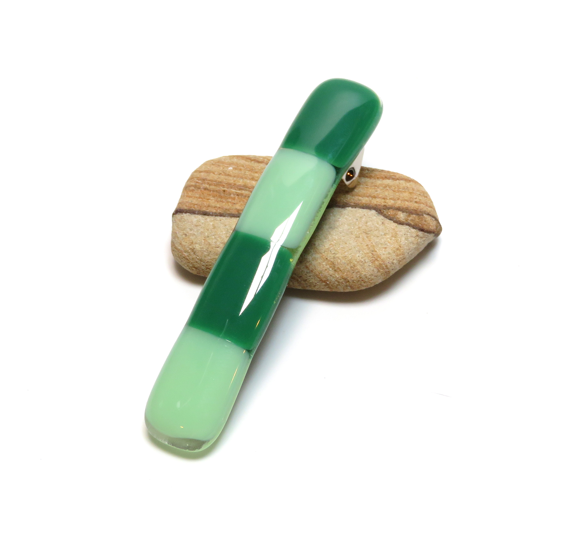 Bring a touch of handcrafted elegance to your everyday style with this green ombre fused glass barrette. The smooth gradient of mint, jade, and deep emerald tones creates a soothing, nature-inspired palette that flatters every hair color and complements any outfit.
