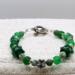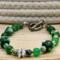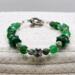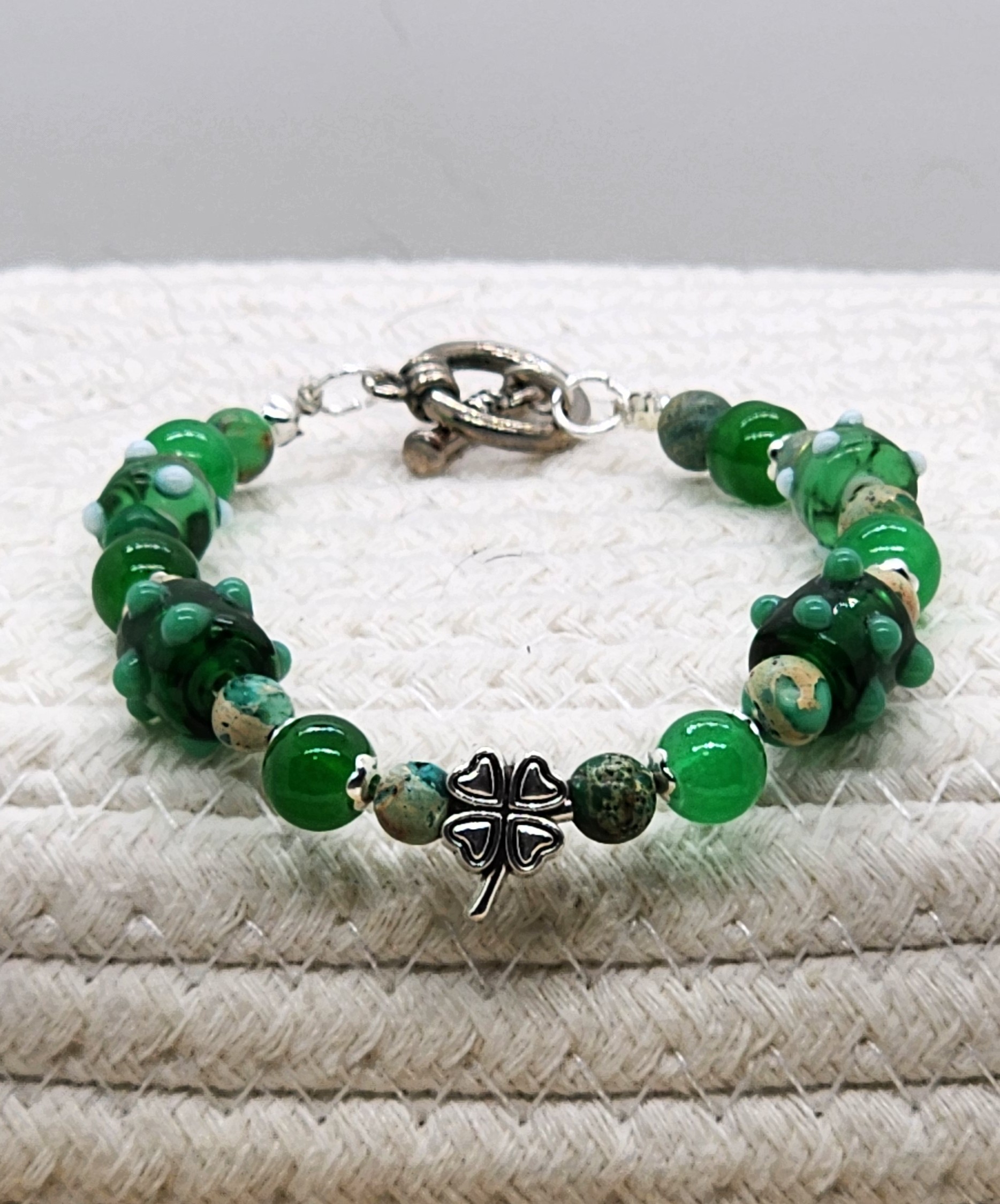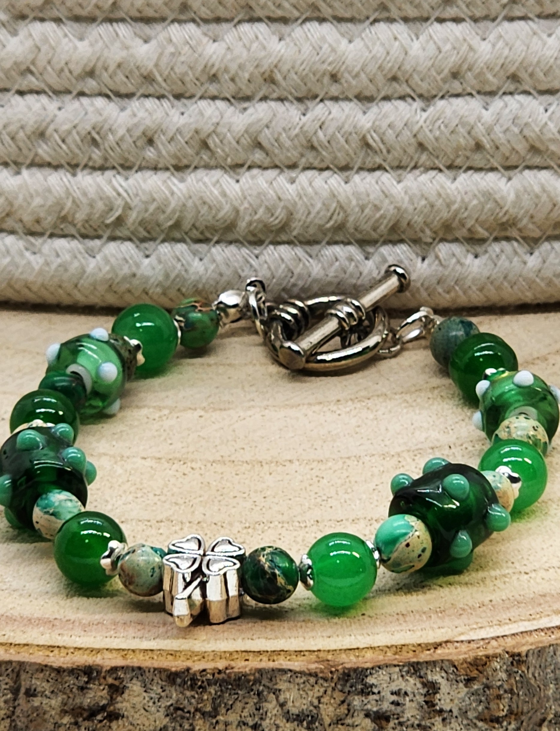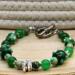 Add a touch of elegance to your St. Patricks Day outfit with this stunning bangle style 8mm green glass and 6mm jasper gemstone beaded bracelet. Adorned with lampwork glass accent beads and a large hole shamrock metal bead, along with small square spacer beads, this bracelet is secured with an elegant silver toggle clasp. It is handmade with 20 gauge silver tone copper wire, with handcrafted loops and wire wrapped coils. Perfect for any occasion!
