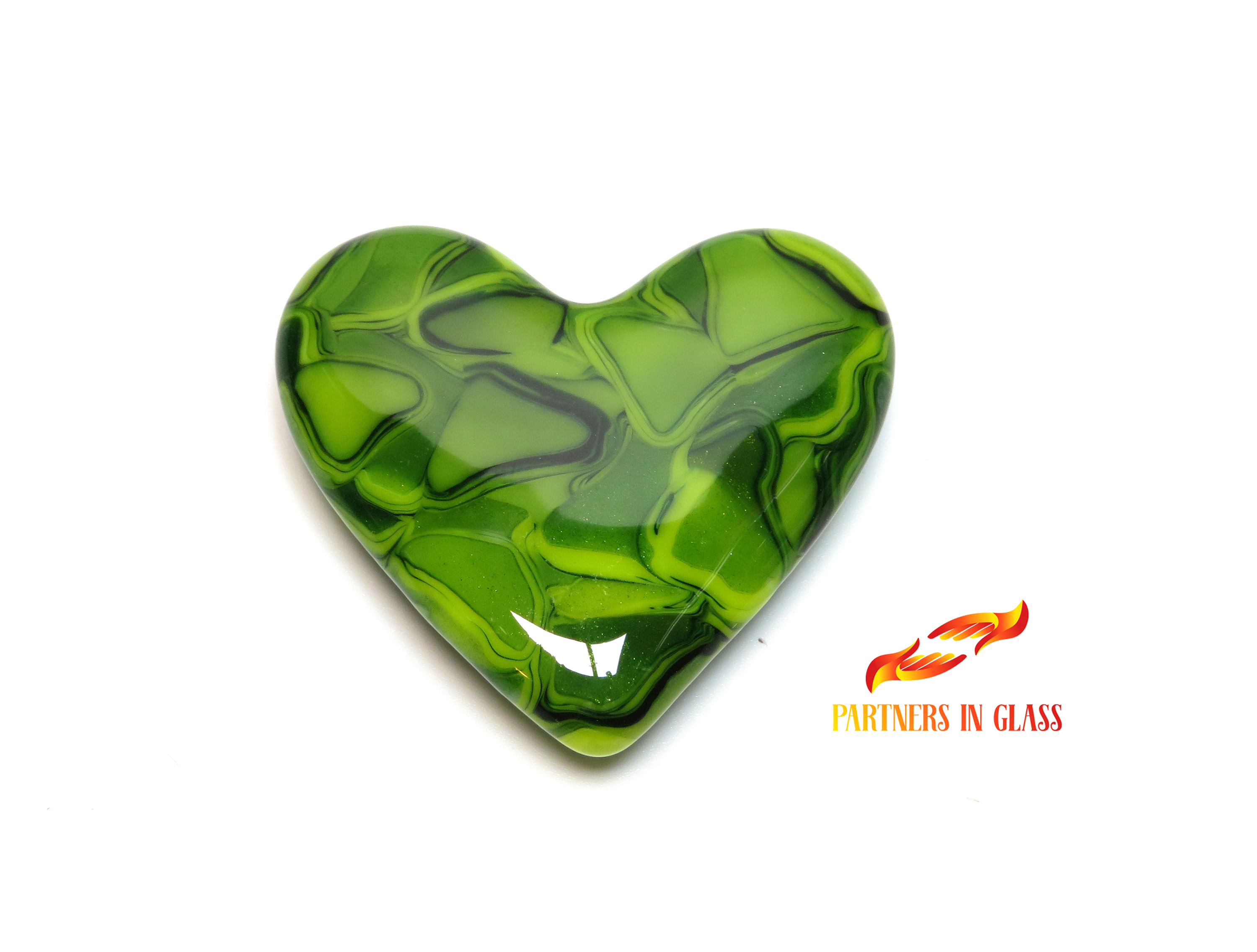 This striking fused glass pocket heart created with green streaky glass offers a one-of-a-kind design and is small enough to be kept in your pocket or purse as a reminder of love, affection, or just a calming companion.