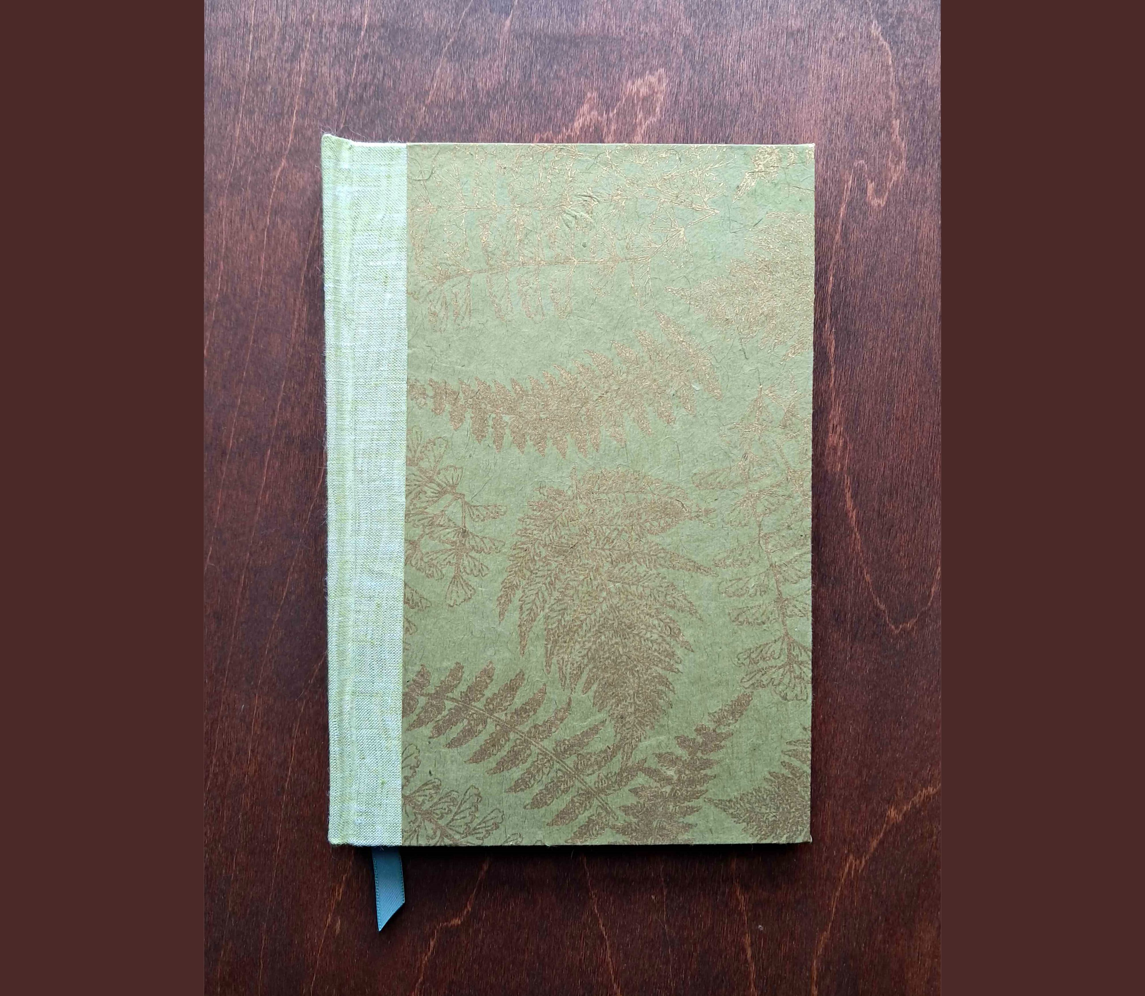 A handmade sketchbook bound in screenprinted lokta paper and linen bookcloth. This book is 9"x6" and filled with 140 pages of 50gsm sketch paper.