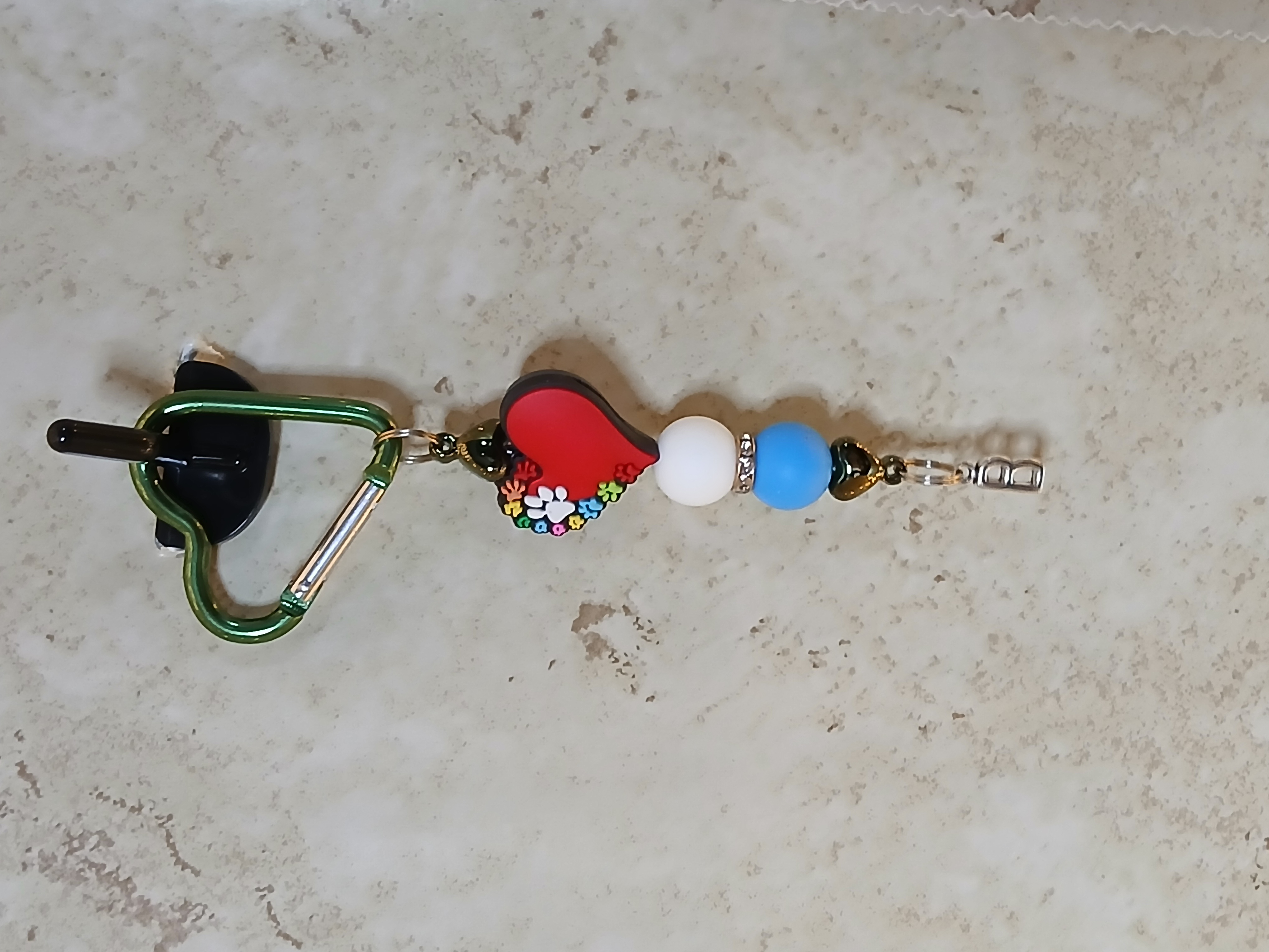 Green heart shaped Carabiner clip style key chain or some call it a bag tag has a red silicone focal with paw prints on it and a white and a blue silicone beads and can have a tassel of initial on it