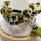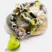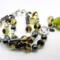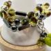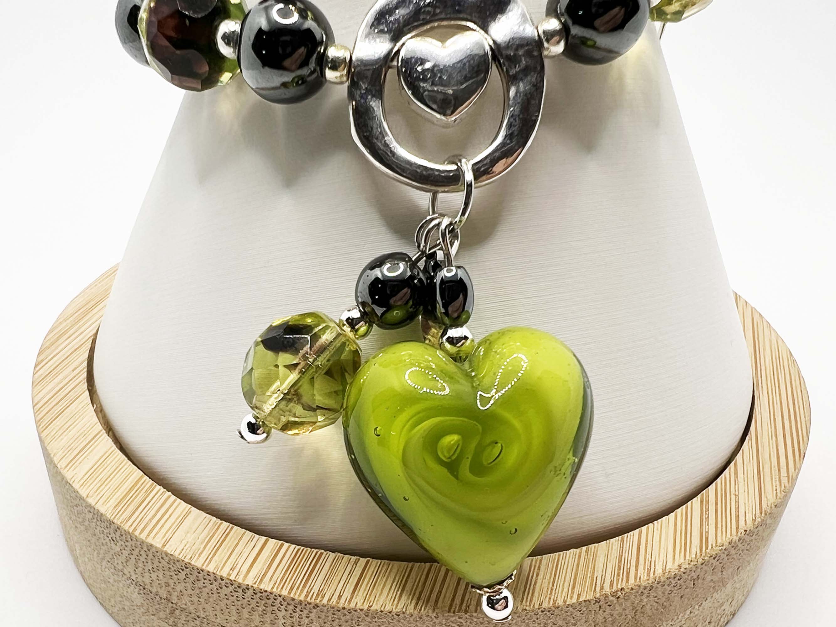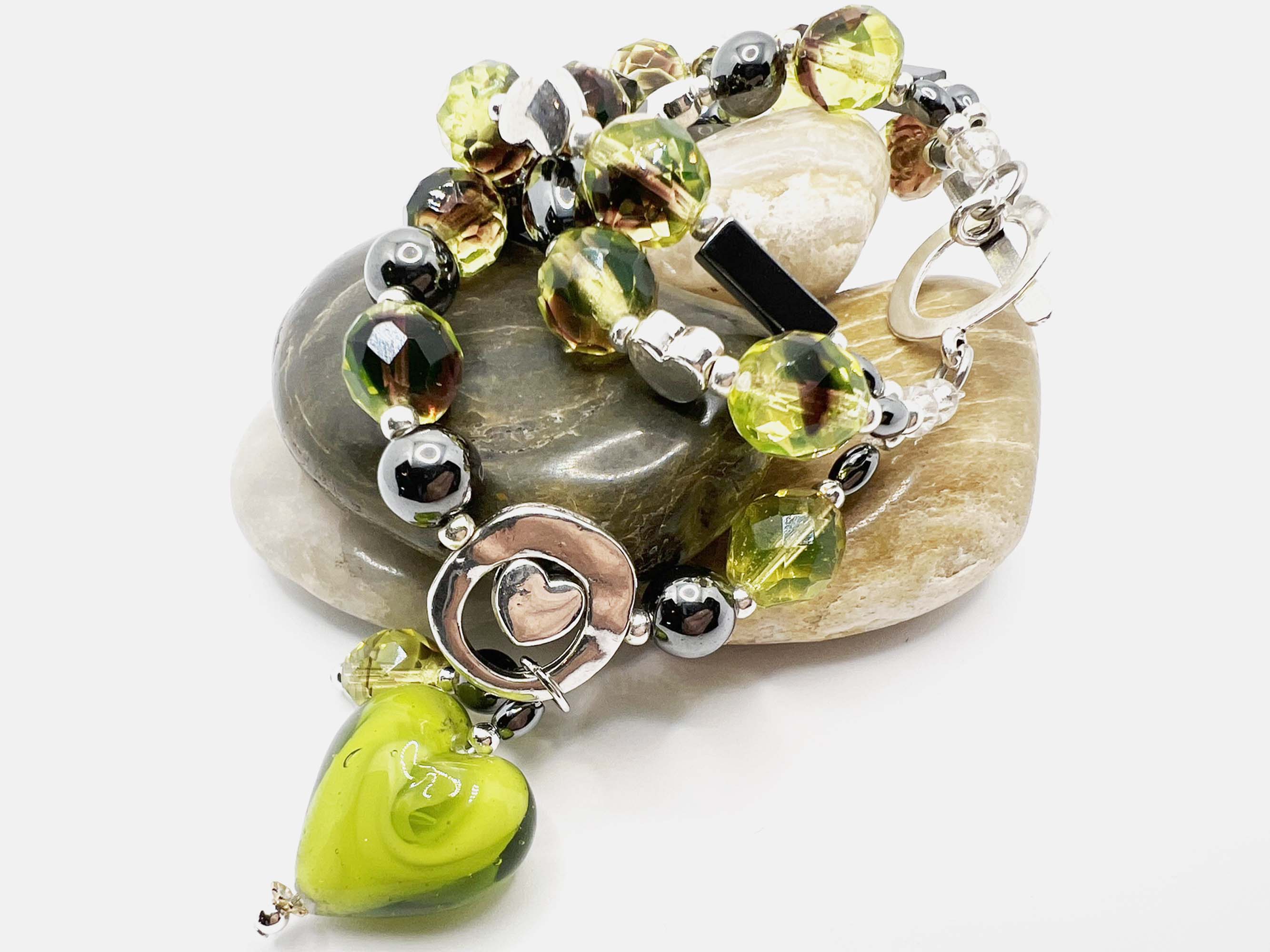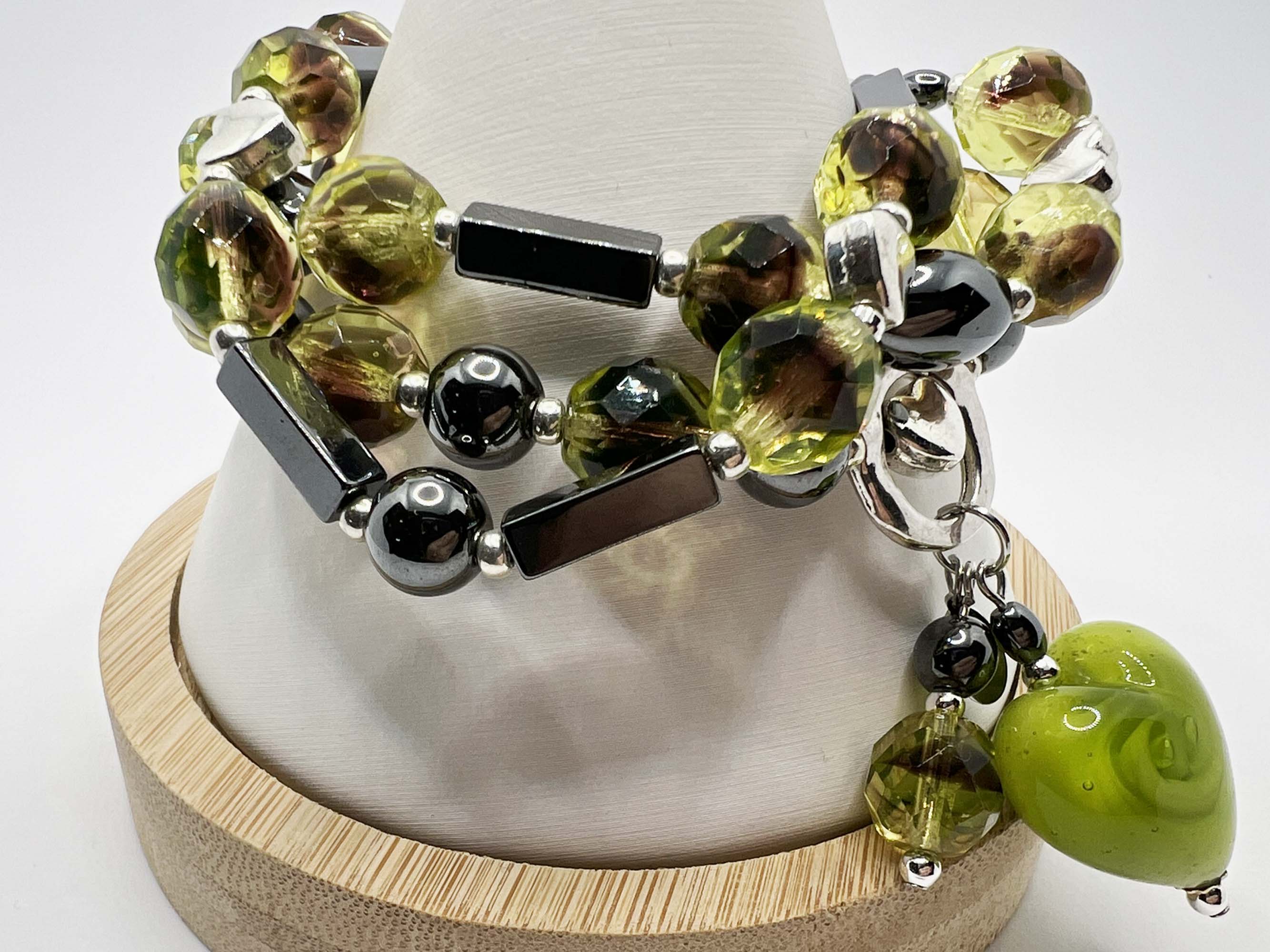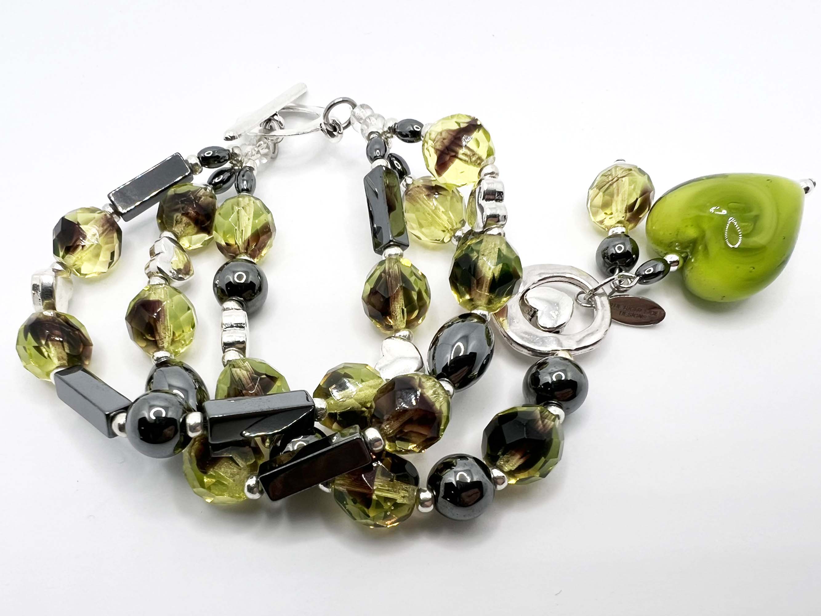 This elegant three-strand bracelet blends earthy tones with a hint of shimmer. It features 17mm faceted glass beads in green and brown hues, paired beautifully with black hematite beads in a variety of shapes — 8mm rounds, 4mm and 10mm ovals, and 12x4mm rectangles.