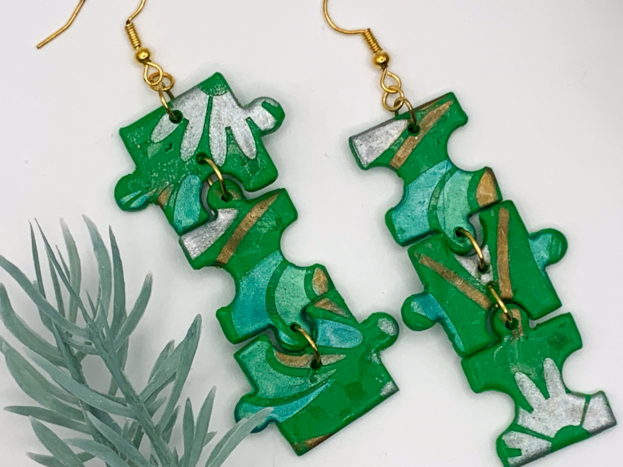 Playful and artistic! These dangling puzzle piece earrings feature layered shades of green with metallic accents for a bold, creative look.