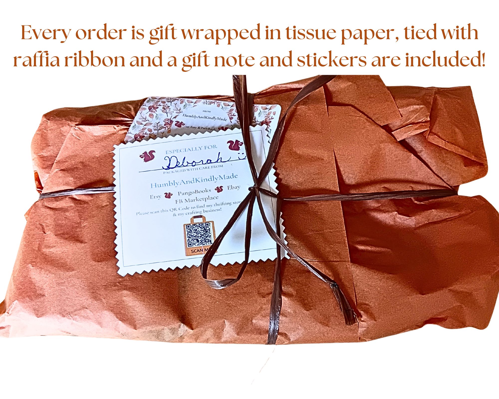 ✨ Every item is gift-wrapped in colorful tissue, tied with raffia ribbon, and finished with a thank-you card which may personalized upon request.