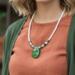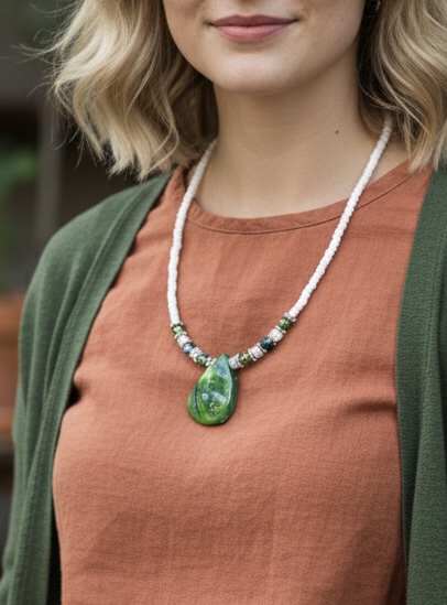This eye-catching necklace features a unique sea shell pendant, available in two captivating colors: vibrant green or serene blue. Each is meticulously handcrafted with a delicate string of white seed beads, creating a minimalist yet sophisticated foundation.