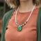 The green piece is accented with a harmonious blend of green and dark purple faceted beads, complemented by white moonstone beads and silver-toned spacers, adding a touch of sparkle and depth. The necklace is secured with a silver-toned lobster clasp and an extender chain, ensuring a comfortable and adjustable fit.