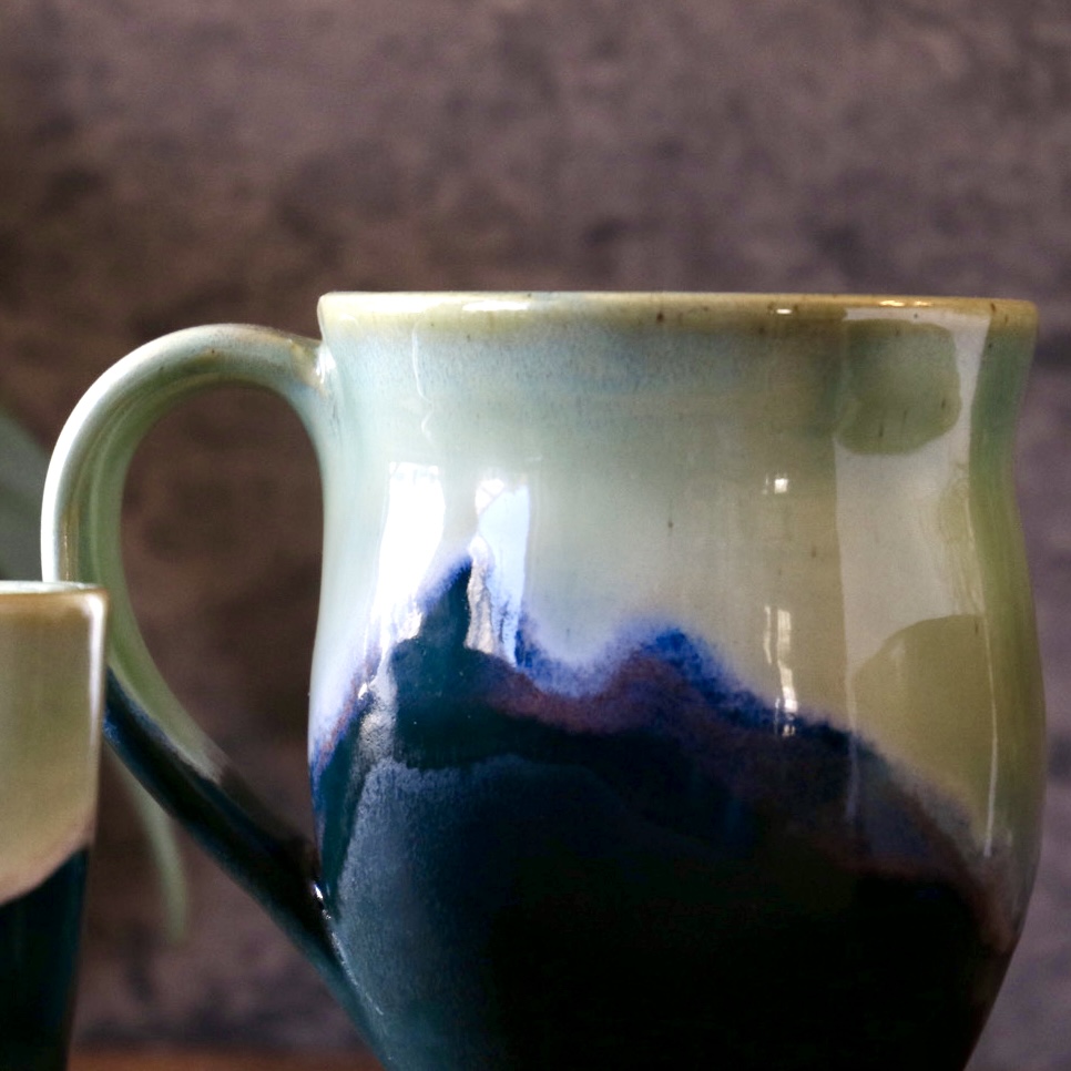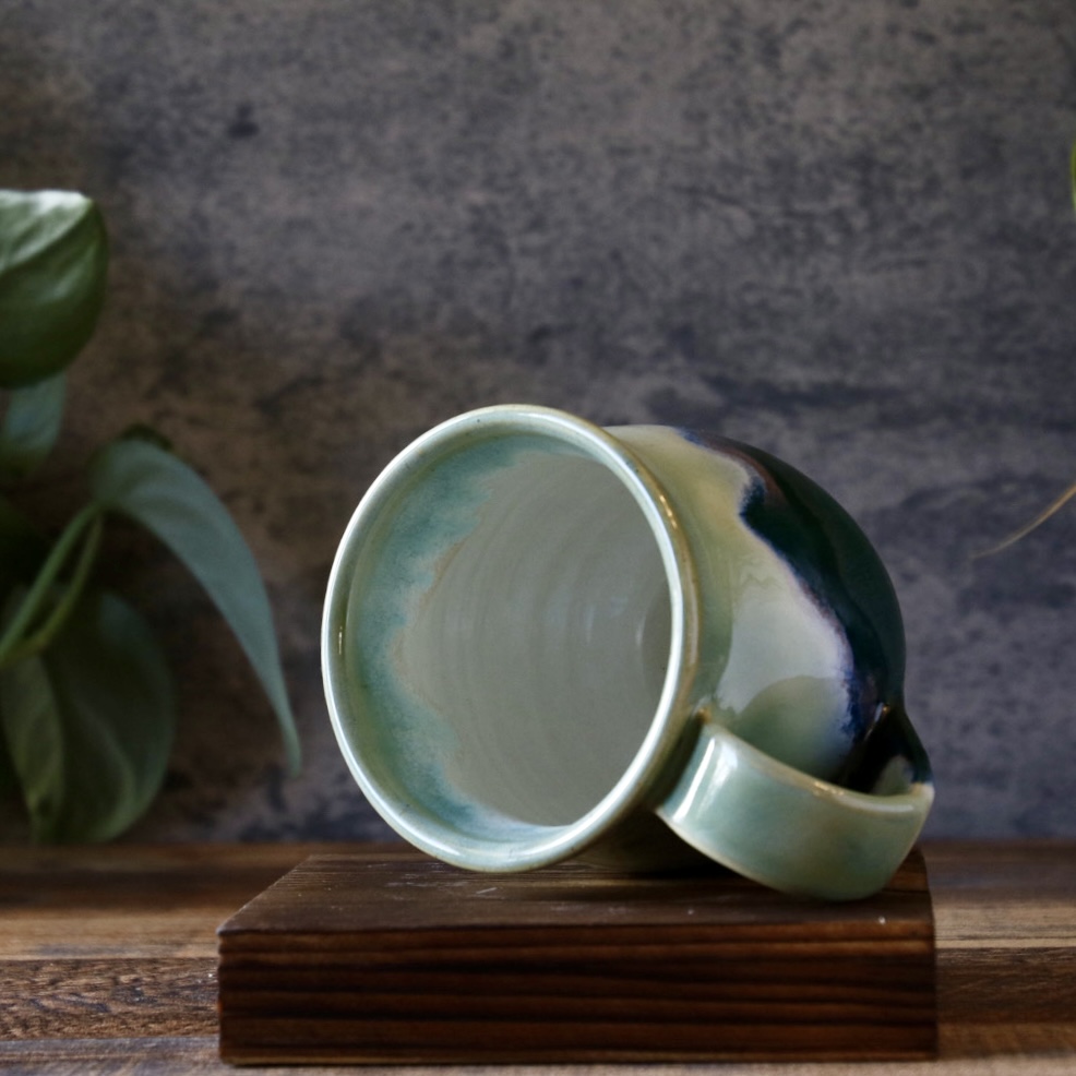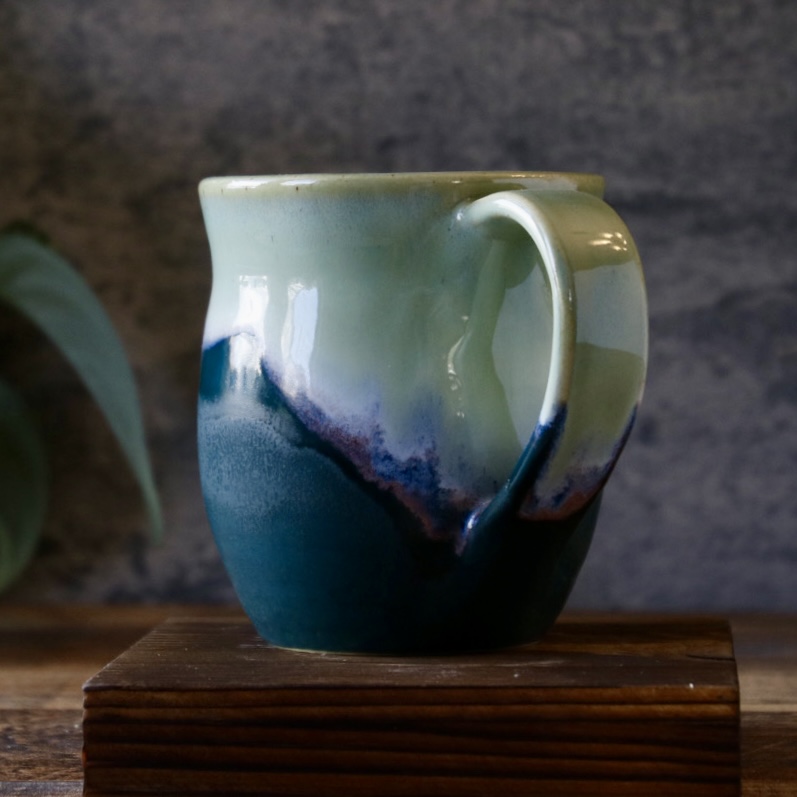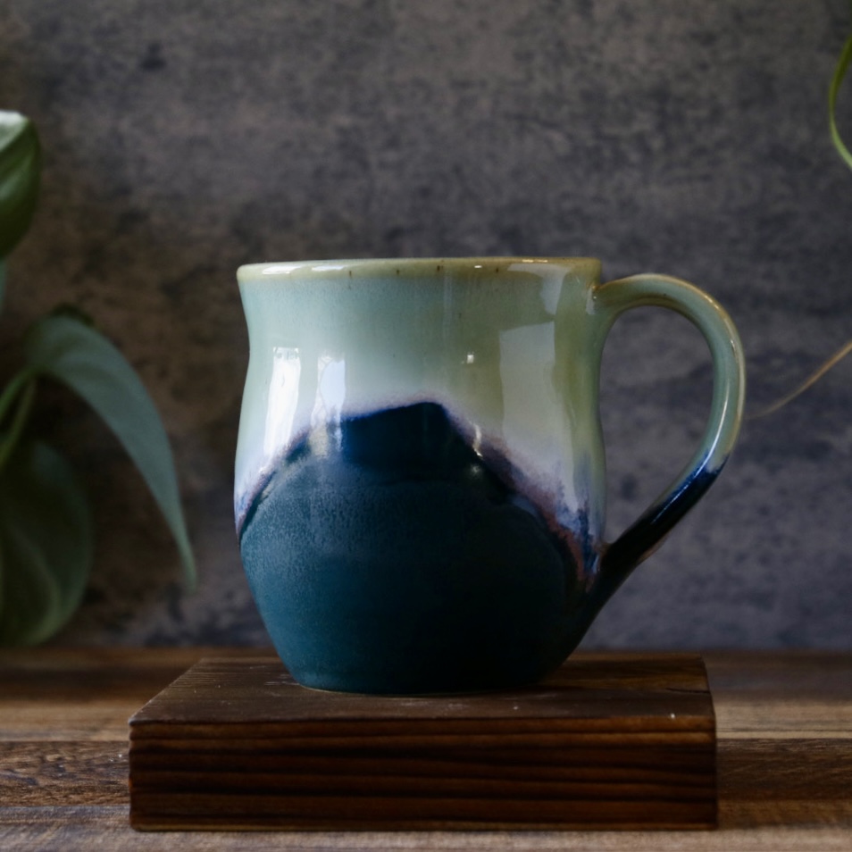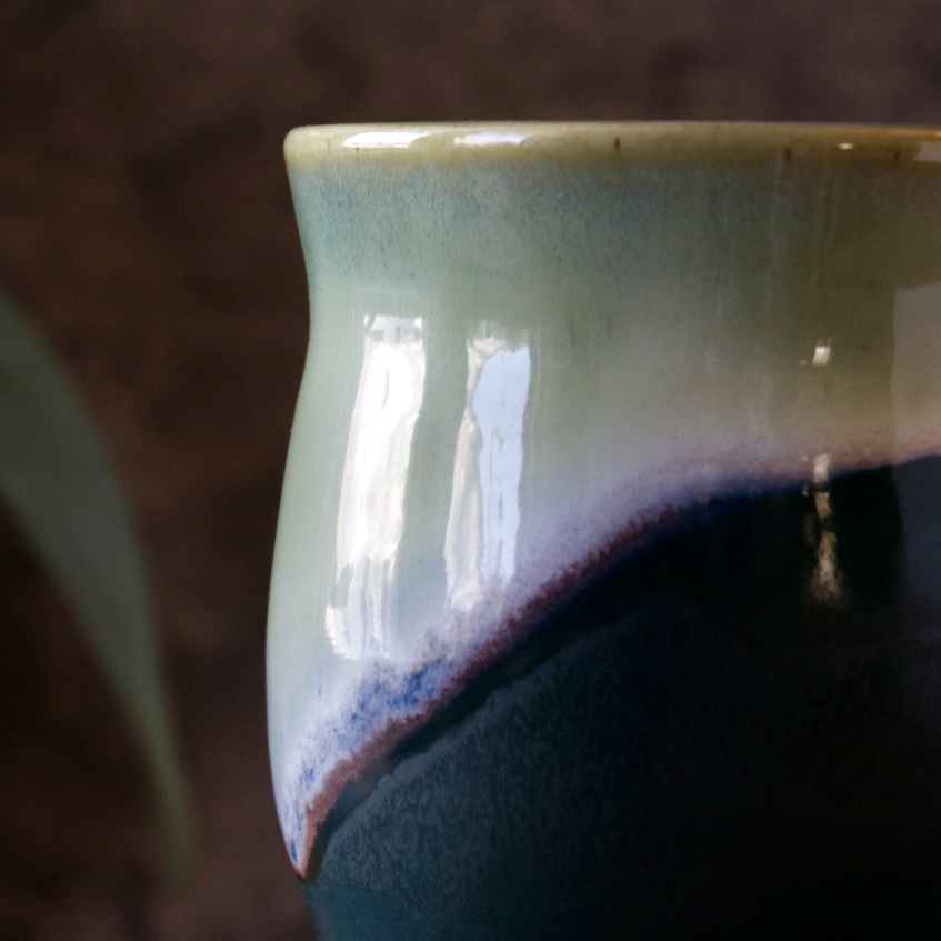 This mug is a pleasure to the senses. The bottom is a satiny matte, with the top a magical light green shiny glaze. It is a comfortable 2-3 finger handle, and holds 10-12oz of liquid. Just enough to stay hot while you drink it, and avoid the reheat in the microwave.