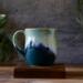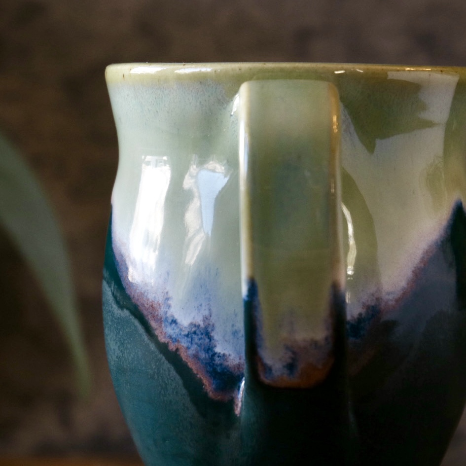 This piece is thrown on the pottery wheel. After drying for 24 hours, the handle is made and attached. Then after a bisque fire, the multiple layers of food safe glazes are painted on by hand. Another firing in the kiln gives you the final magic.