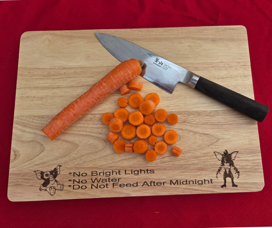 A rubberwood cutting board featuring characters from the iconic film "Gremlins," such as the adorable Gizmo and the mischievous Stripe, is both a charming and sustainable kitchen accessory. Rubberwood, often hailed for its eco-friendliness, is harvested from rubber trees that have reached the end of their latex-producing cycle, making it a renewable resource. This cutting board ensures food safety and durability while adding a touch of nostalgia with its laser-engraved designs. The detailed engravings depict the three crucial rules from the movie: keep them away from bright light, never get them wet, and never feed them after midnight. This unique piece not only serves a practical purpose but also sparks conversation and brings a bit of cinematic magic into your culinary space. The large size of 13.75"x9.75" makes this board ideal for slicing hams, roasts, and other oversized foods.