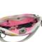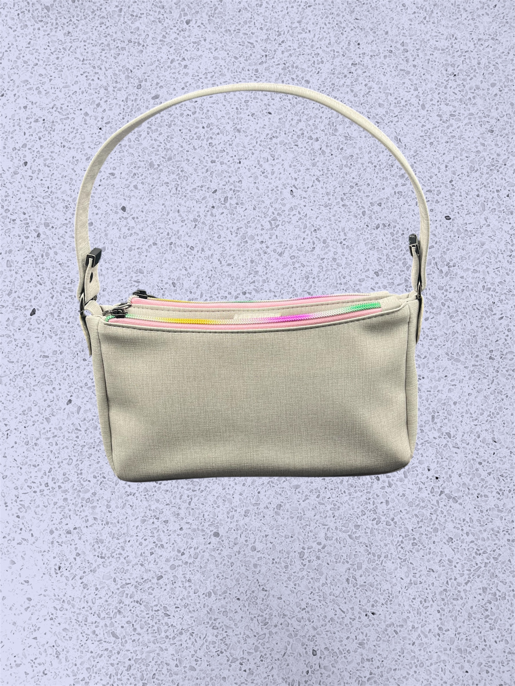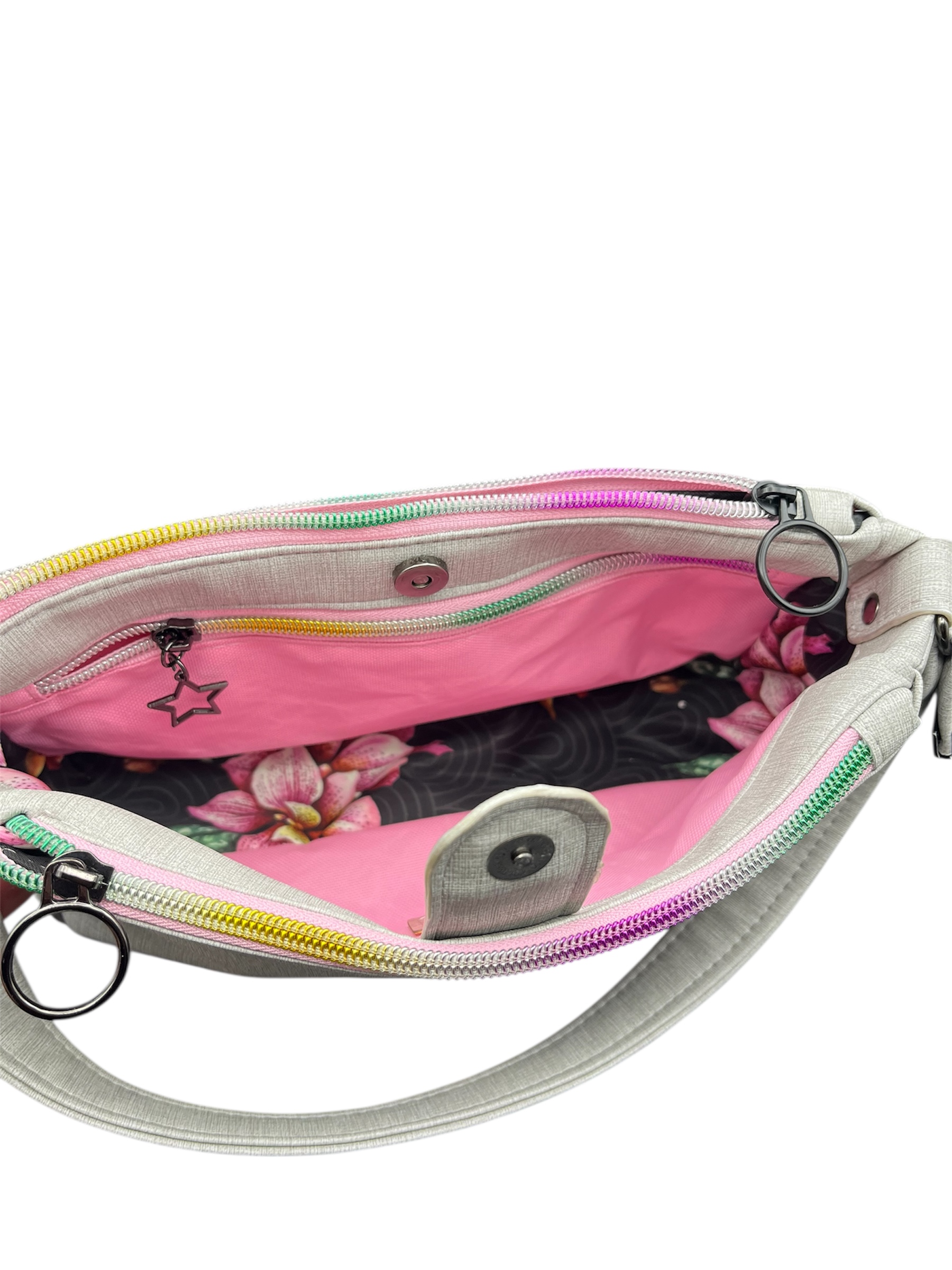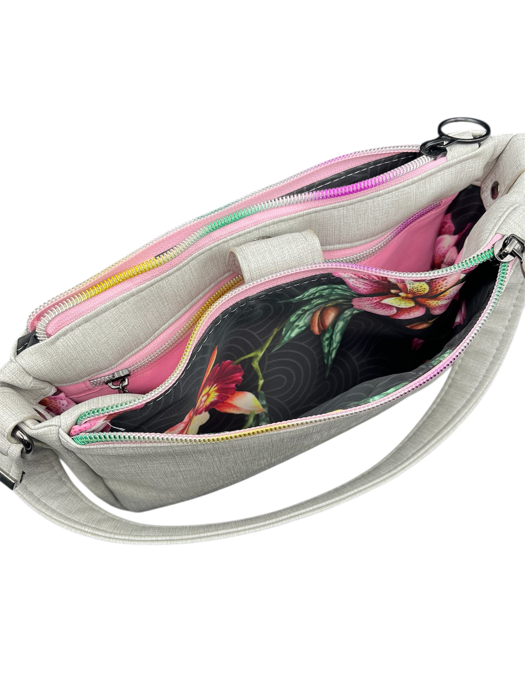 Crafted from a soft gray vinyl with a subtle linen texture, this bag is designed for versatility. The real showstopper? Two vibrant rainbow zippers that open to reveal a bright pink interior and a stunning floral lining, bringing joy and color every time you reach inside. The double-zip design offers excellent organization for your daily essentials, from your phone and keys to a small notebook or cosmetics.