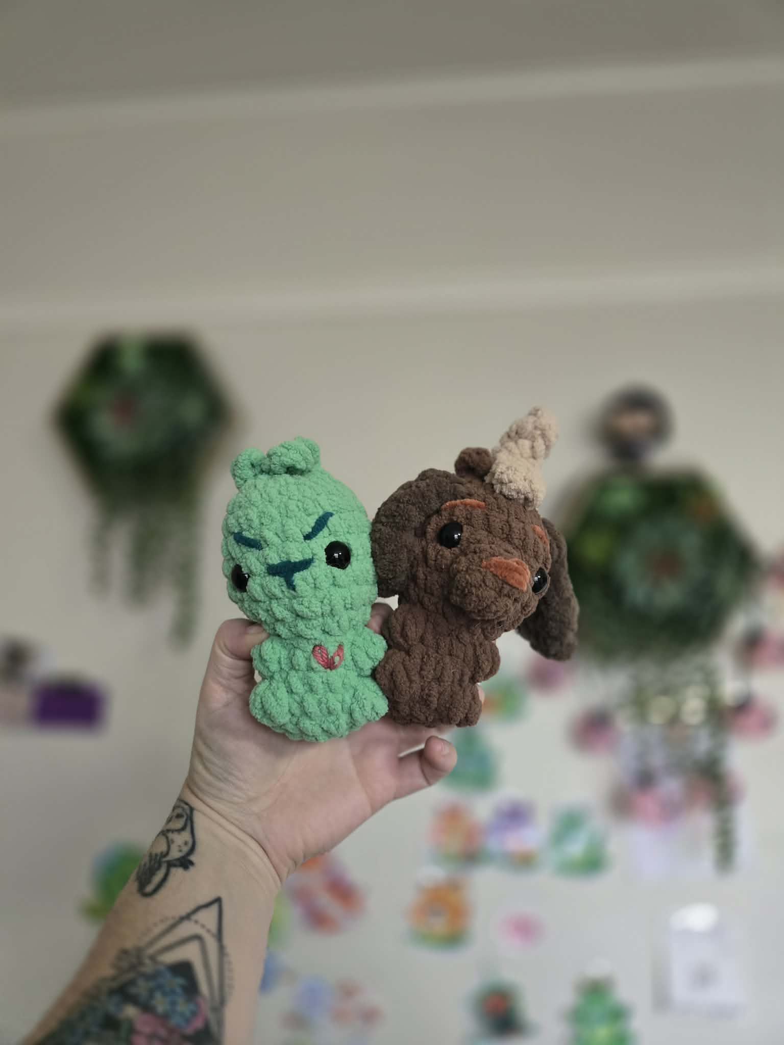 Handmade crochet plushy. made from size 6 blanket yarn, with poly fil. safety eyes to ensure durability. embroidered eyes can be done upon request. <3 washer and dryer safe: suggested item to be put into an established load for both washing and drying