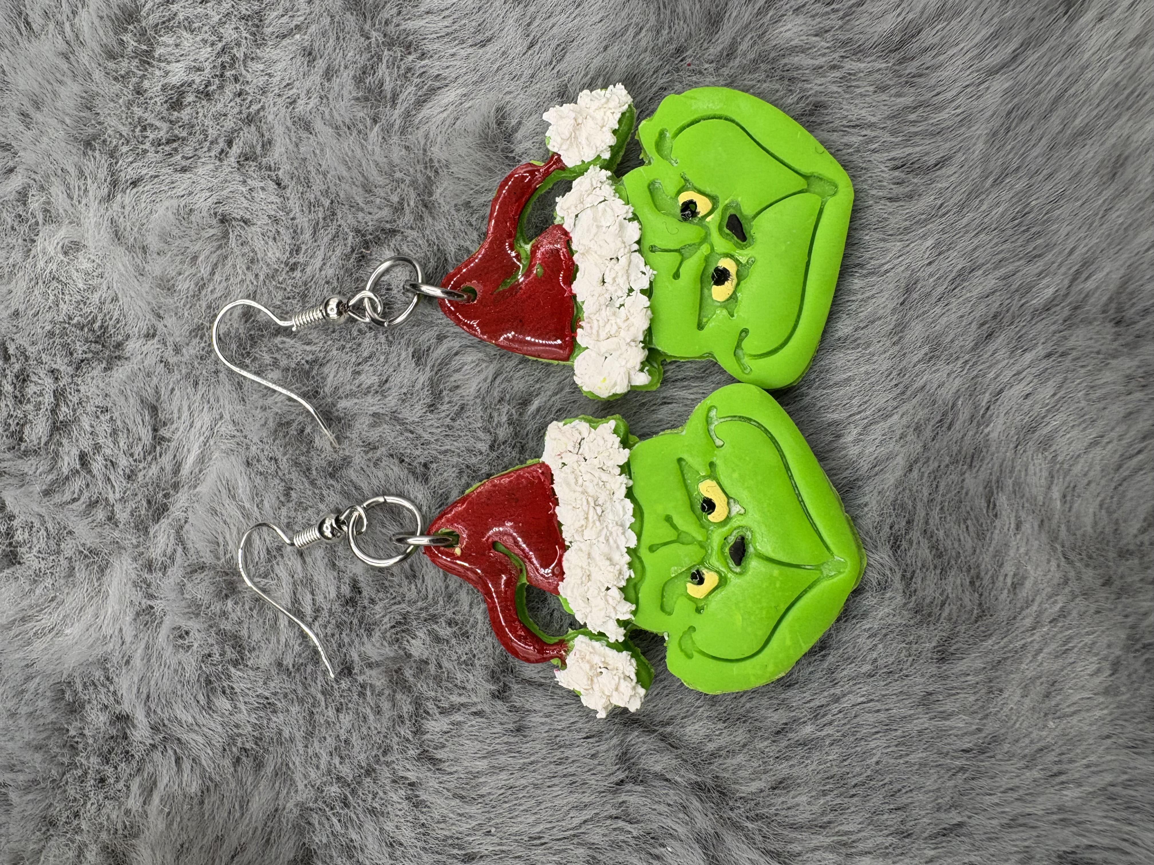 Get into the Christmas spirit with Grinch inspired dangle earrings! They are lightweight, made from polymer clay and hand painted. These earrings are fun to wear with any outfit! They are approximately 2inches long. They are made with stainless steel hooks.