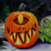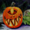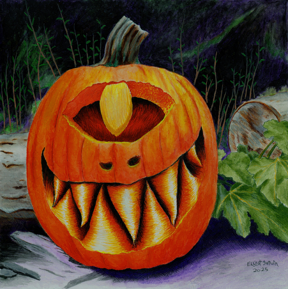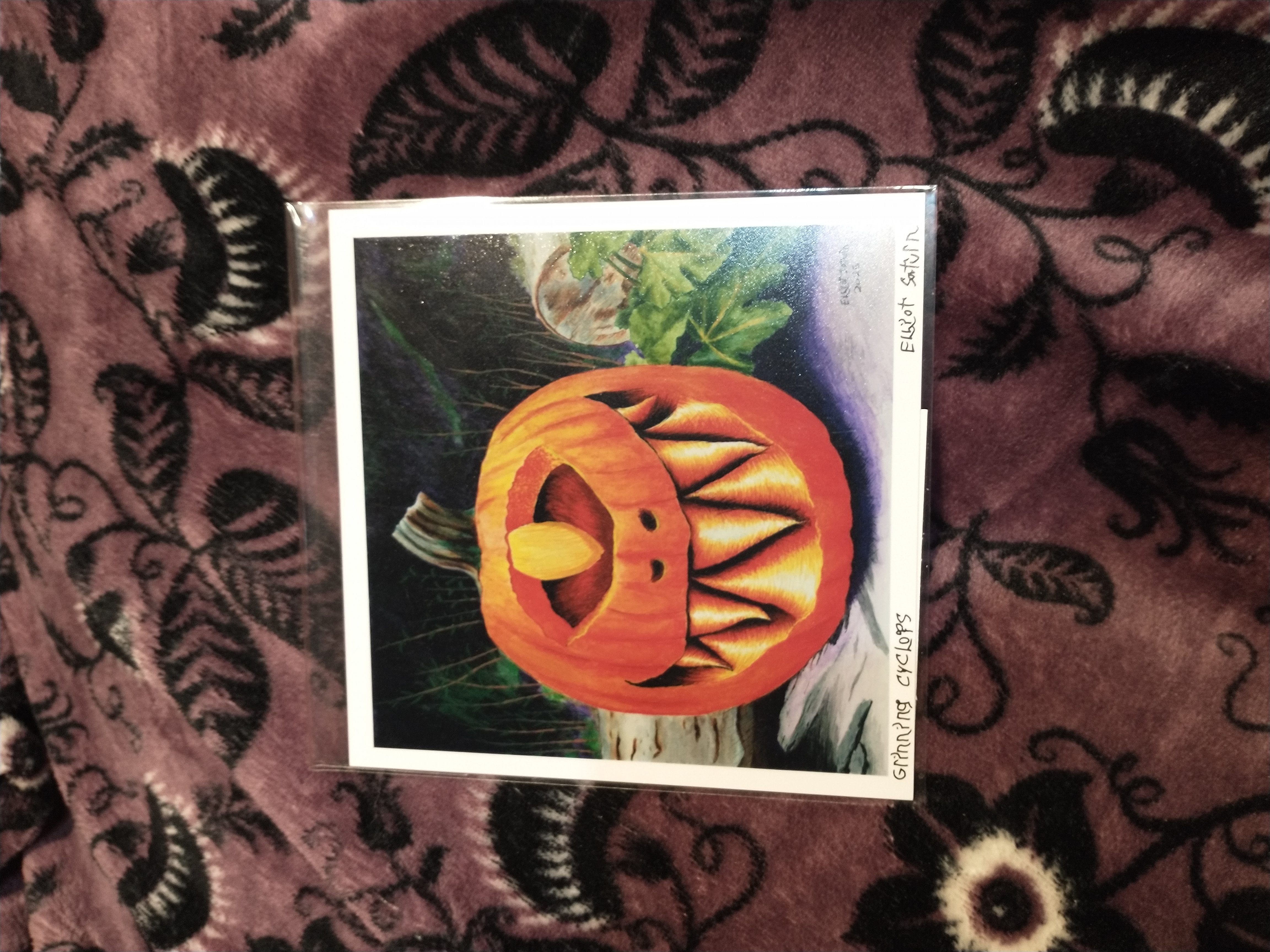 a 5 inch by 5 inch print on photo paper of a watercolor and micron pen painting of a grinning cyclopes jack o lantern.